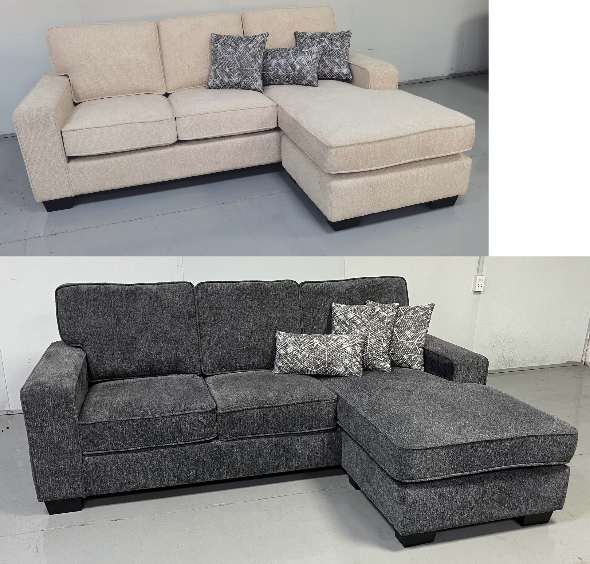 New. Comfortable Cushion Stationary Sectional Sofa • Reversible Chaise 3 colors. Available SECTIONAL Size: 84.77 x 60.98 x 35.83 in. H (LOVESEAT Size: 53.94 x 36.65 x 35.83 in. H CHAISE Size: 30.83 x 60.98 x 35.83 in. H Colors: Grey, Brown, Beige.