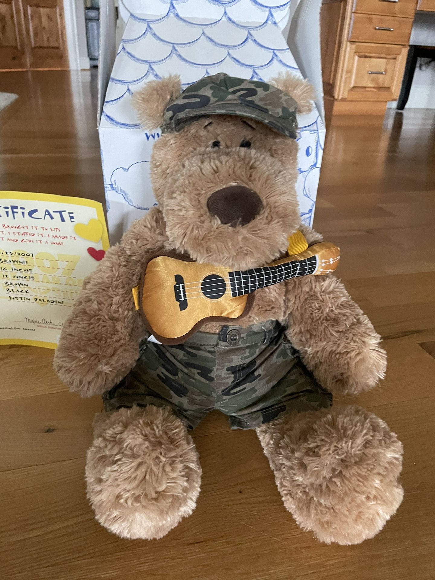 Retired build a bear camouflage pants and hat with guitar. Son made in 2007 in Disneyland, brand new and never played with him, just sat him on shelf Getting rid of his items Smoke and pet free home