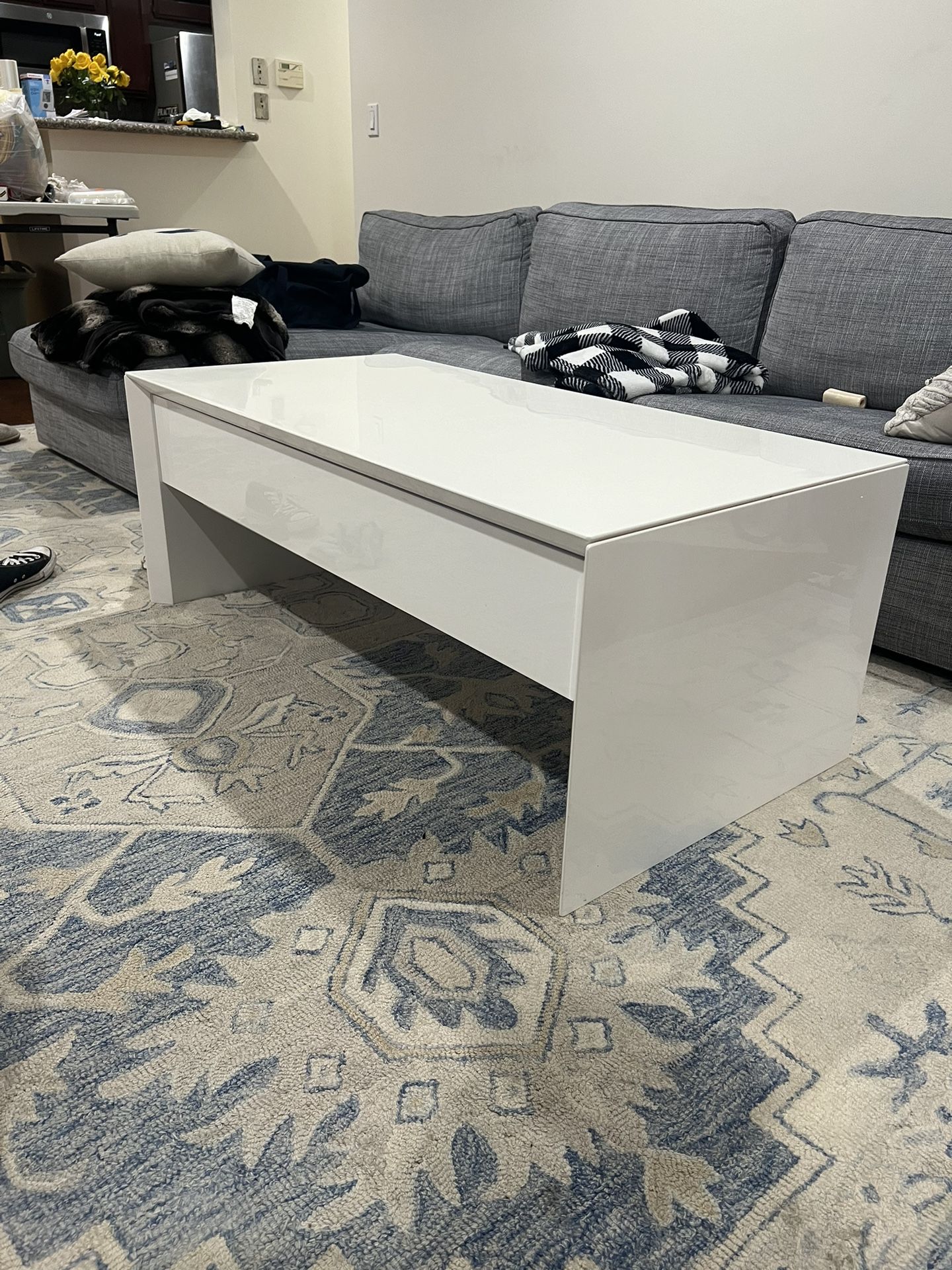 Used acrylic coffee table that lifts up for storage and making it easy to eat while sitting on your couch. The table has a few scrapes please see pictures. This coffee table goes great with my dining table white that is also for sale. Please check it out for yourself!