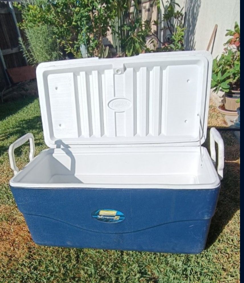 Firm price/precio fijo No holds / no aparto Mantiene el hielo frío por varios días. Perfecta para camping, fiestas o BBQ. Interior limpio, no tiene fugas. Muy espaciosa caben de 190 hasta 204 sodas. : This size cooler is designed to hold a large volume, typically accommodating around 190 to 204 cans Extra large Coleman Xtreme 5 Cooler Box /chest