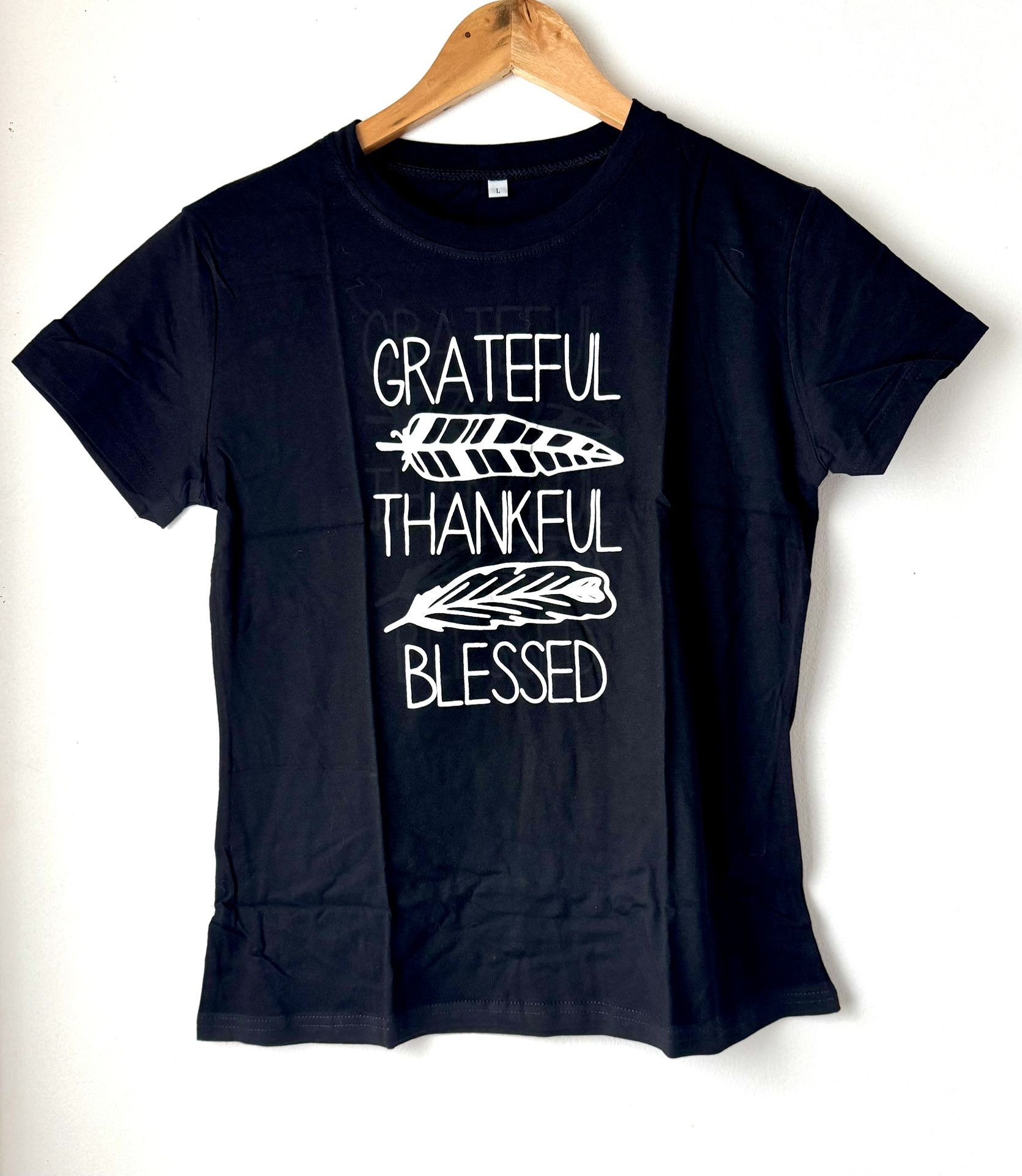 Women’s Grateful Thankful Blessed T-Shirt, Black. Size Large. Measurements: Chest 39”, Length 26”. Polyester/Cotton. NWT. #grateful #thankful #blessed #tshirts #womenstops #womensshirt