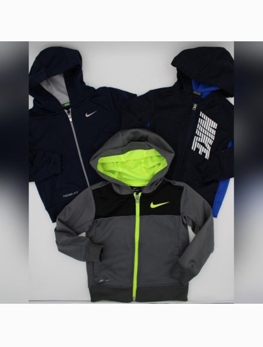 Condition: Preowned, good used condition. All items have the Nike logo slightly peeling as pictured in the listing photos. Features: - Dri-Fit technology - Full zip-up front - Two side pockets on each hoodie - Therma-Fit material (on at least one item) Included Hoodies: Hoodie 1: Navy blue with white Nike logo lettering and bright blue stripes along the side. Hoodie 2: Navy blue with a grey zipper and grey Nike logo. Hoodie 3: Black, grey, and highlighter yellow color block design. Perfect for layering and active toddlers.