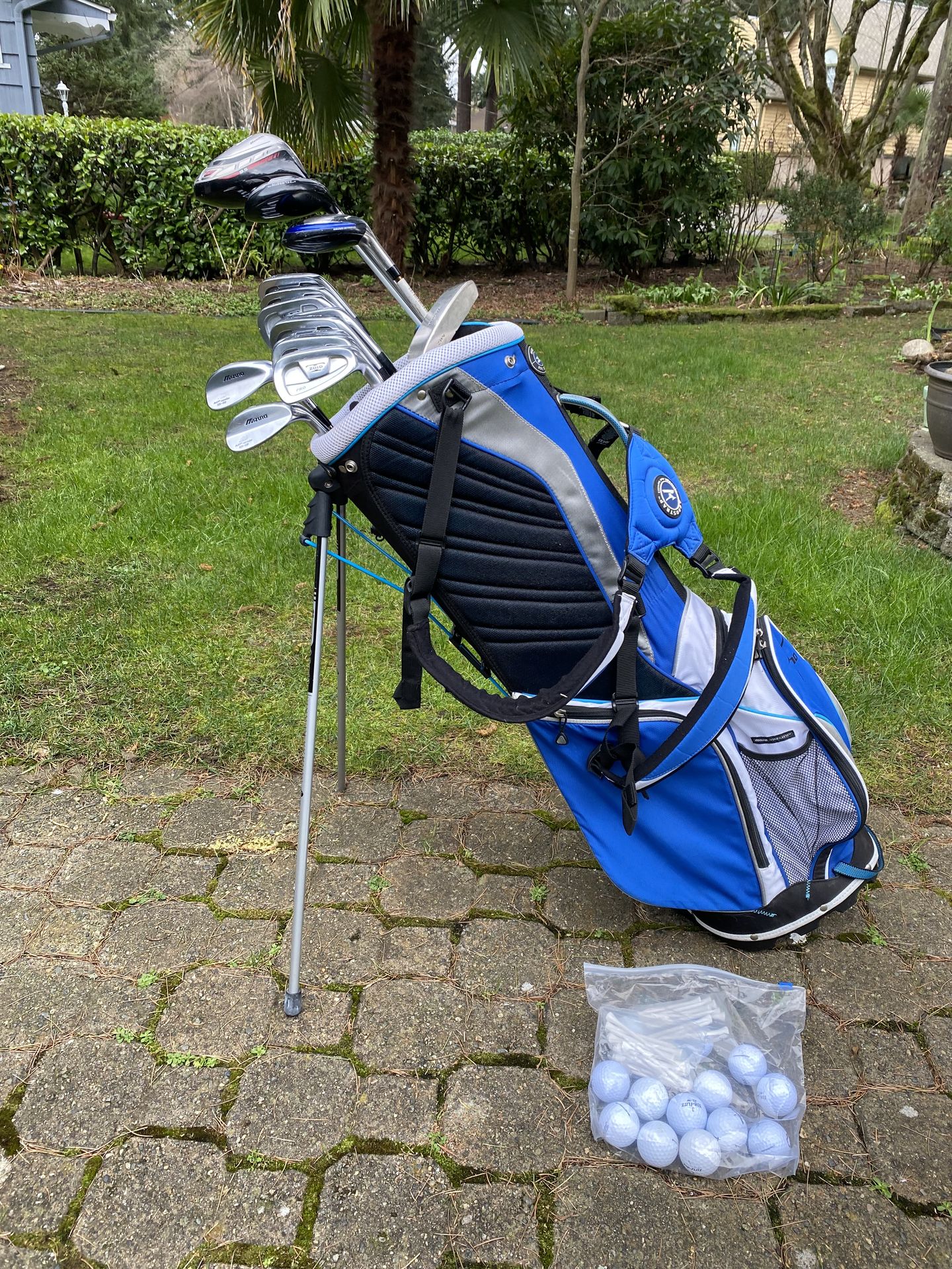 Complete set of Mizuno golf clubs with bag and balls