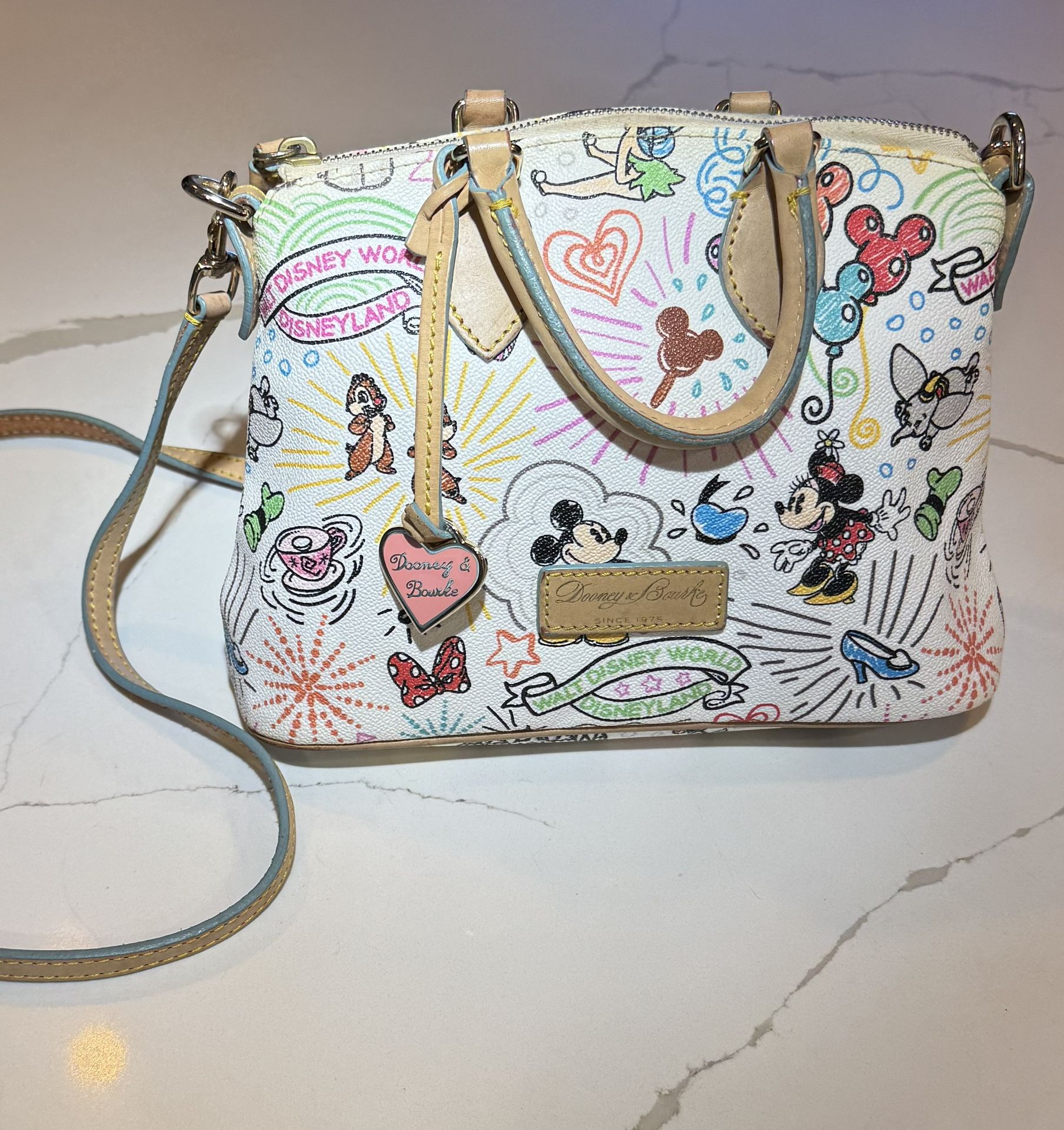**LIKE NEW** Tote your daily essentials in this strapping handbag by Dooney & Bourke. Mickey's fine fashion purse with fun, festive styling comes to you direct from Disney Parks and the designer label you love. Magic in the details Created especially for Walt Disney World Resort and Disneyland Resort Disney Parks icon pattern includes Mickey Mouse, Minnie Mouse, Tinker Bell, Chip n' Dale, Dumbo, Cheshire Cat, and more* Screen art on coated cotton* Walt Disney World and Disneyland banners Stitched leather trim Top zip closure with double leather pull Interior zippered pocket Three interior open pockets, including cell phone pocket Interior key strap with toggle clasp Top carry handles Removable adjustable shoulder strap Metal feet Fully lined Goldtone hardware ''Dooney & Bourke 1975'' embossed leather label inside ''Dooney & Bourke'' embossed logo plate on front The bare necessities Coated cotton / leather / metal 10'' H x 11 1/2'' W x 5'' D Carry handles fall 5'' L Strap drop: 15 1/2'' Tote your daily essentials in this strapping handbag by Dooney & Bourke Mickey's fine fashion purse with fun, festive styling comes to you direct from Disney Parks and the designer label you love Disney Parks icon pattern includes Mickey Mouse, Minnie Mouse, Tinker Bell, Chip n' Dale, Dumbo, Cheshire Cat, and more Screen art on coated cotton with Walt Disney World and Disneyland banners Stitched leather trim and top zip closure with double leather pull Interior features zippered pocket, three open pockets (including cell phone pocket), and interior key strap with toggle clasp Top carry handles and removable adjustable shoulder strap Metal feet and fully lined with goldtone hardware "Dooney & Bourke 1975" embossed leather label inside and "Dooney & Bourke" embossed logo plate on front Crafted from coated cotton, leather, and metal with dimensions of 10" H x 11 1/2" W x 5" D