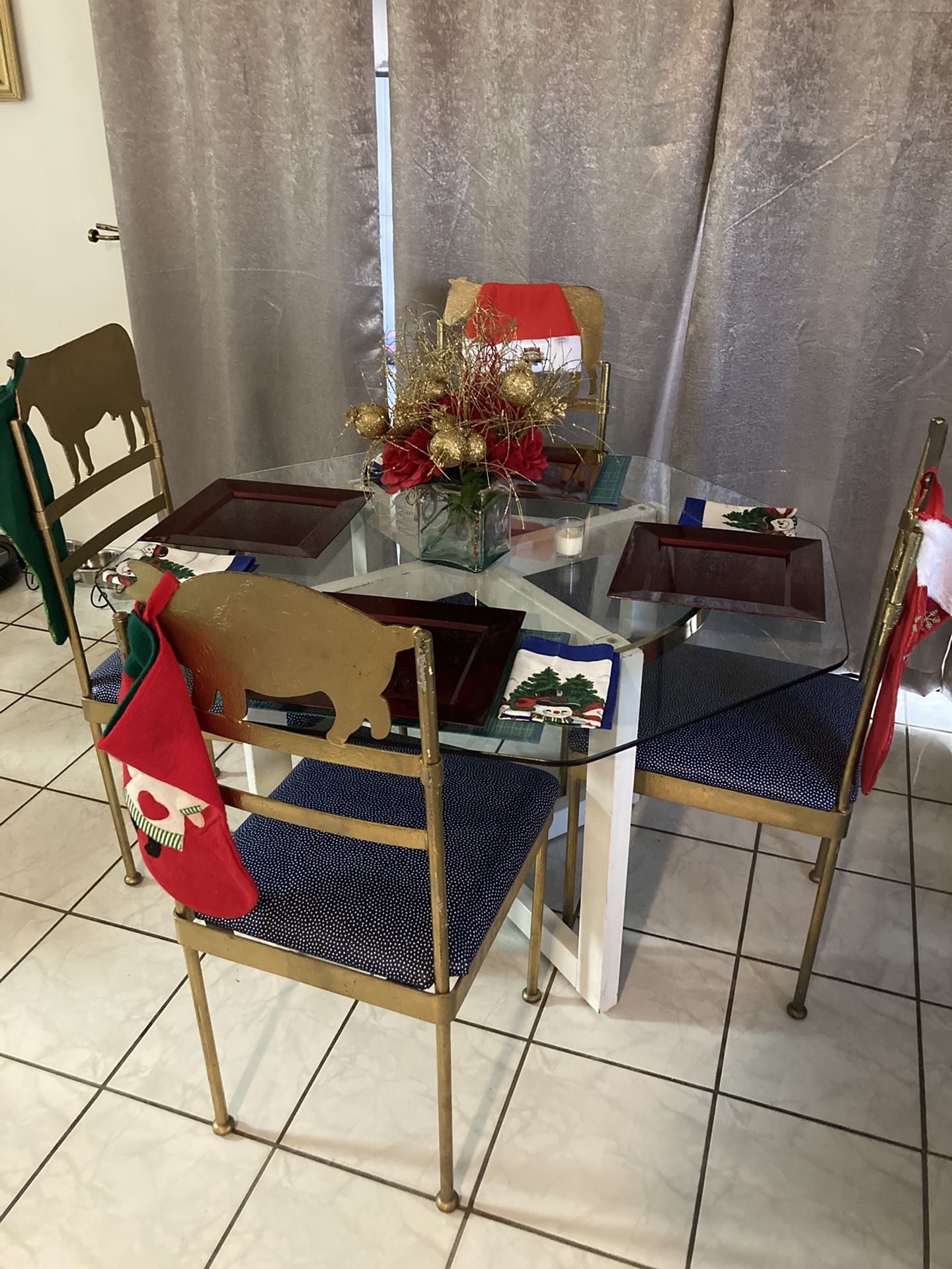 Set of 4 Newly Reupholstered/ Refinished Gold/ Navy Blue w/ White dots Kitchen/ Dining/ Game Room Chairs $150 for chairs with table