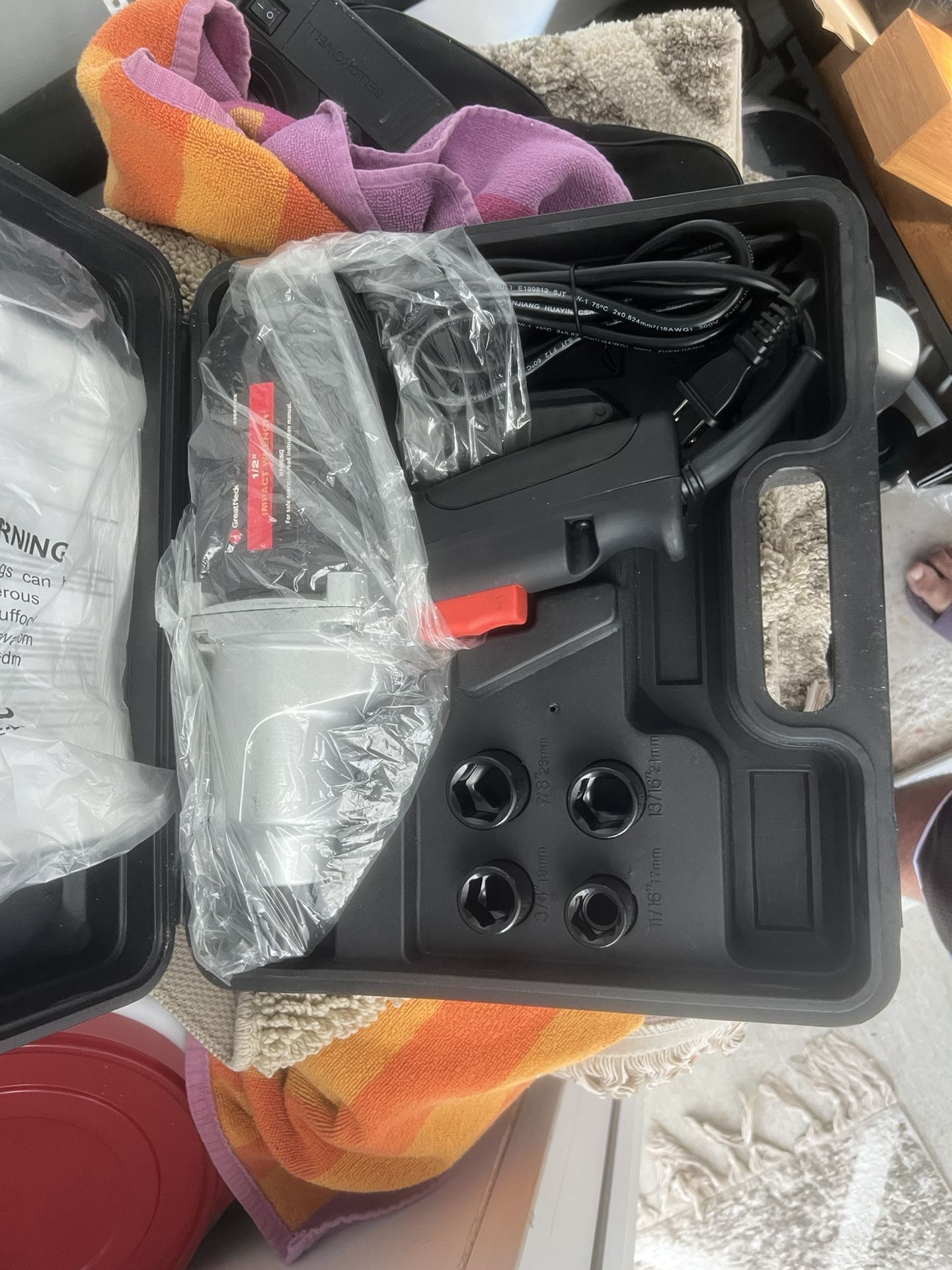 Great neck corded impact gun works great will need a new ring for the end, includes case and 4 impact sockets