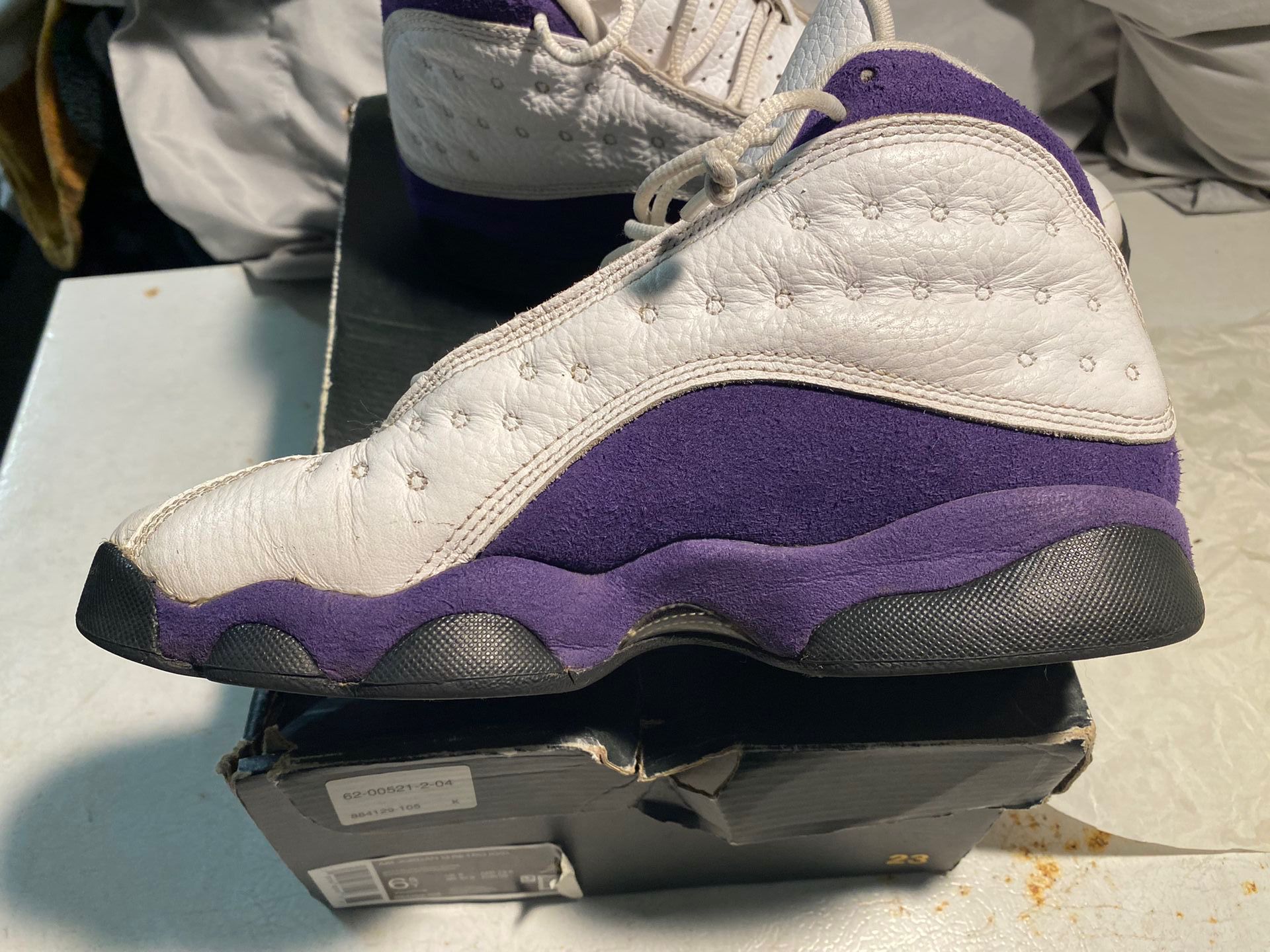 Used pair Jordan 13 retro white/ purple See photos for condition ask more questions if desired. Size 6.5y I think it’s the original box and wrap but beat up a bit