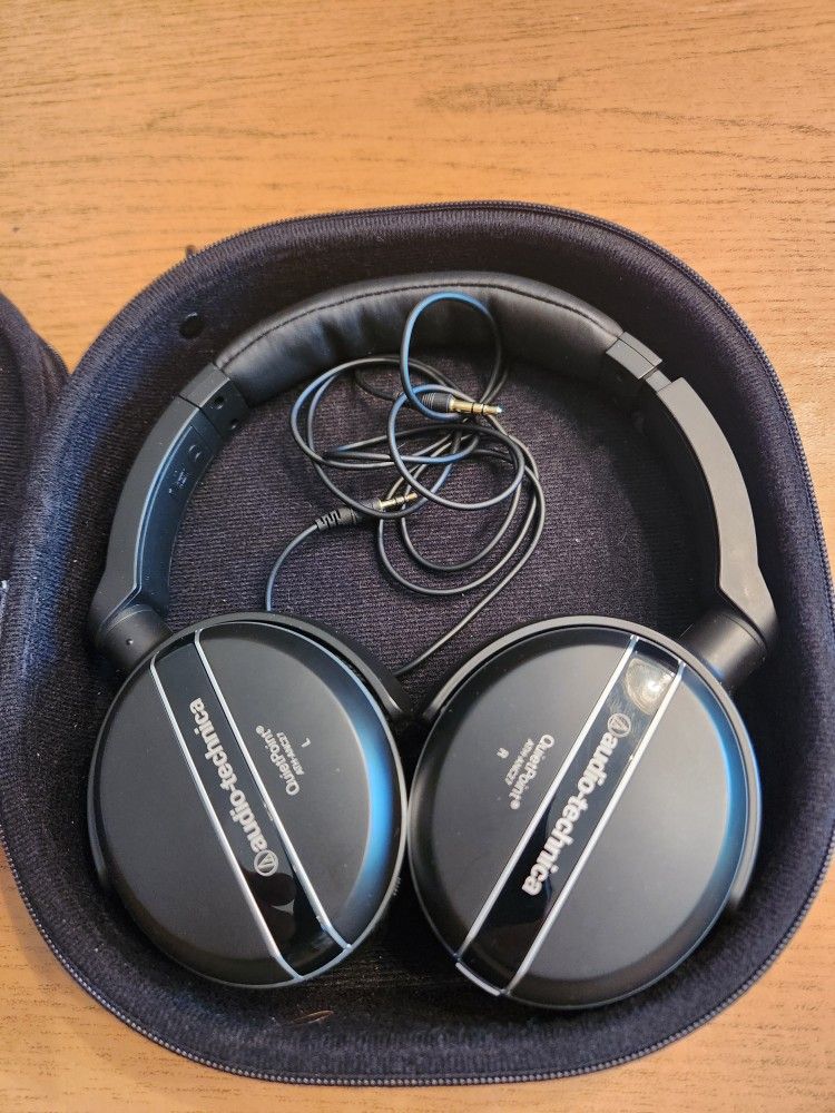 Excellent condition and comes with case and manual. Works great on airplanes. Description from Audio Technica: Audio-Technica’s ATH-ANC27 QuietPoint® headphones use active noise-cancelling technology to provide a comfortable listening environment in areas with high ambient noise. The headphones feature a miniature microphone in each earpiece that picks up ambient noise and creates a sound-cancelling signal to effectively block the noise. • QuietPoint® active noise cancelling headphones cut ambient noise by up to 85% • Use for MP3, CD, DVD and in-flight entertainment systems; remove detachable cable for noise-cancelling function without audio input • Audio functions (in passive mode) even without the batter • Fully integrated electronics—no external modules needed • Compact design folds flat for travel • Includes a durable carrying case with attached pouch for accessories