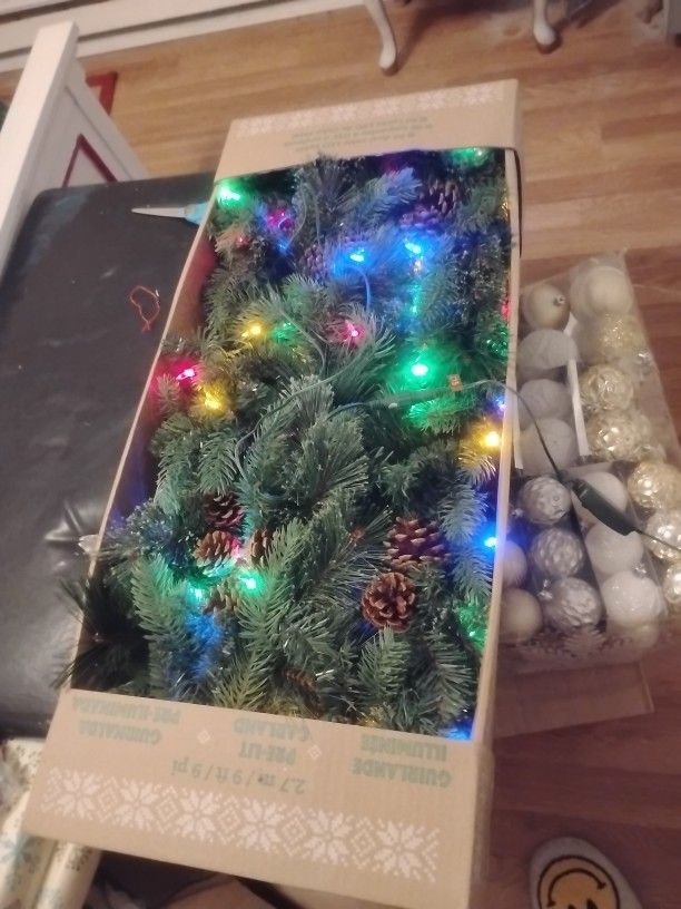 This Garland is 9 ft long he has dual color LED lights any other questions you have you can see the pictures it explains everything never used never out of the box one pair the box got damaged on the other pair I have a second pair one in the box one out they both are brand new serious inquiries only please and thank you