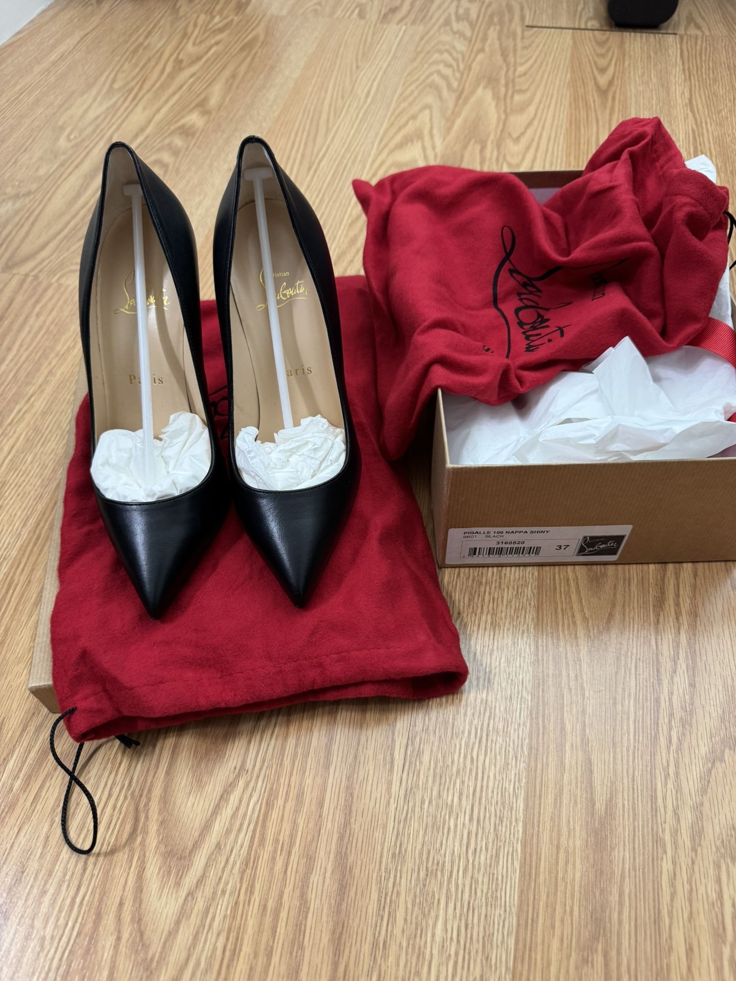 Selling a pair of brand new, never worn Christian Louboutin Pigalle 100 heels in shiny black nappa leather, size 37. These were received as a wedding gift, but my wife decided she won’t be wearing them. They’ve never been worn and are in perfect condition. Original receipt from 2018 is included. Please see photos for details. Details: • Model: Pigalle 100 (Style #(contact info removed)) • Size: 37 • Color: Shiny Black Nappa Leather Includes: • Original box • Two red Louboutin dust bags (one for each shoe) • Heels Retail price: $945 Asking: $850 Cash only. Local pickup.