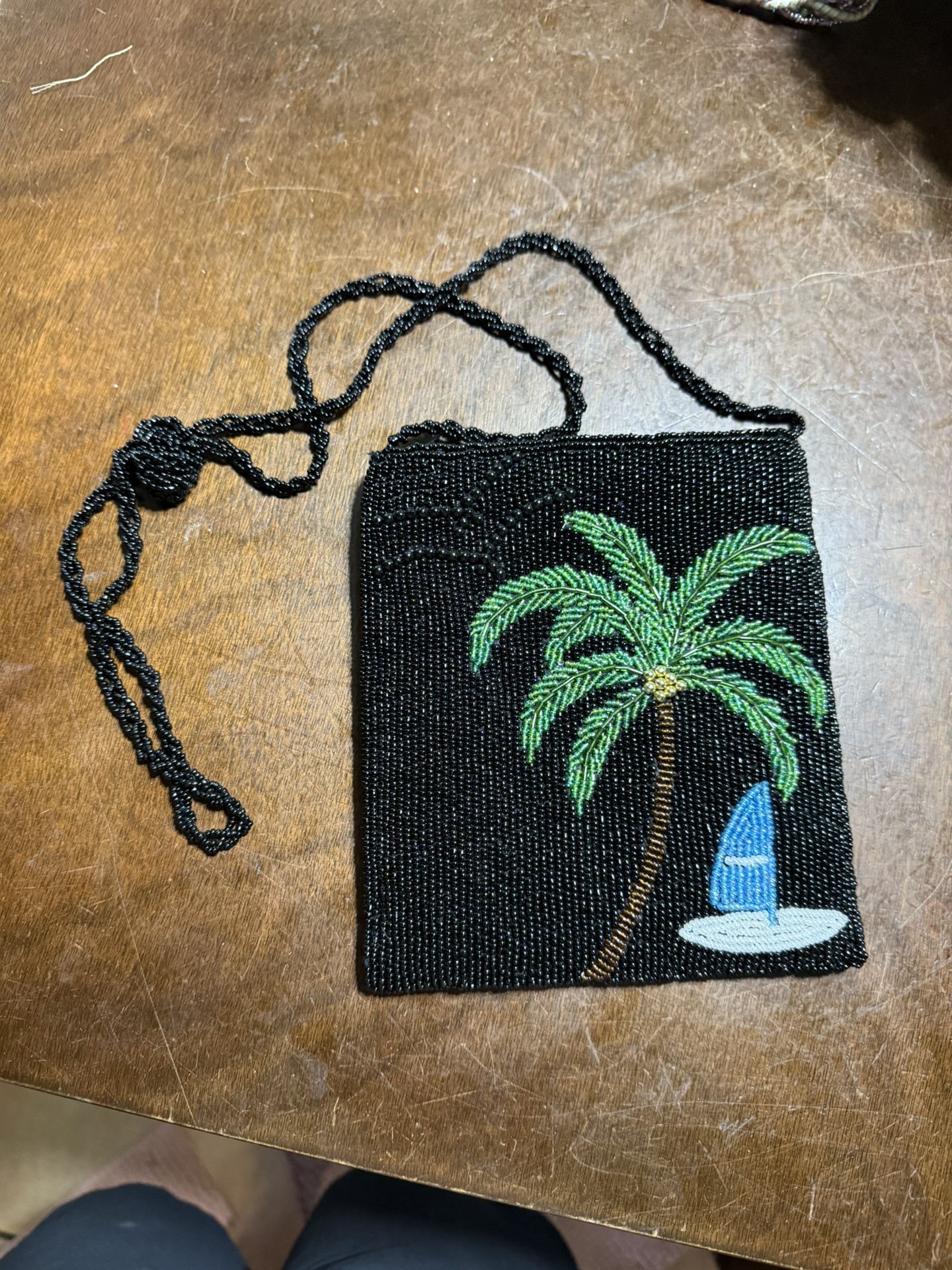 A sleek, hand-beaded mini bag with a subtle coastal vibe—perfect for Florida living. The black seed bead base is detailed with a palm tree and surfboard design, giving it just the right pop of color and texture. ⸻ ✅ Features: • Fully beaded front in black with embroidered palm and surfboard design • Lightweight and compact—ideal for festivals, beach days, or travel • Twisted beaded strap for crossbody or shoulder wear • Lined interior with zipper closure (not shown) ⸻ Great for someone who wants a touch of beach energy without going full tourist. Easy to pair with casual or dressy outfits. 📬 Message if interested. First come, first served.