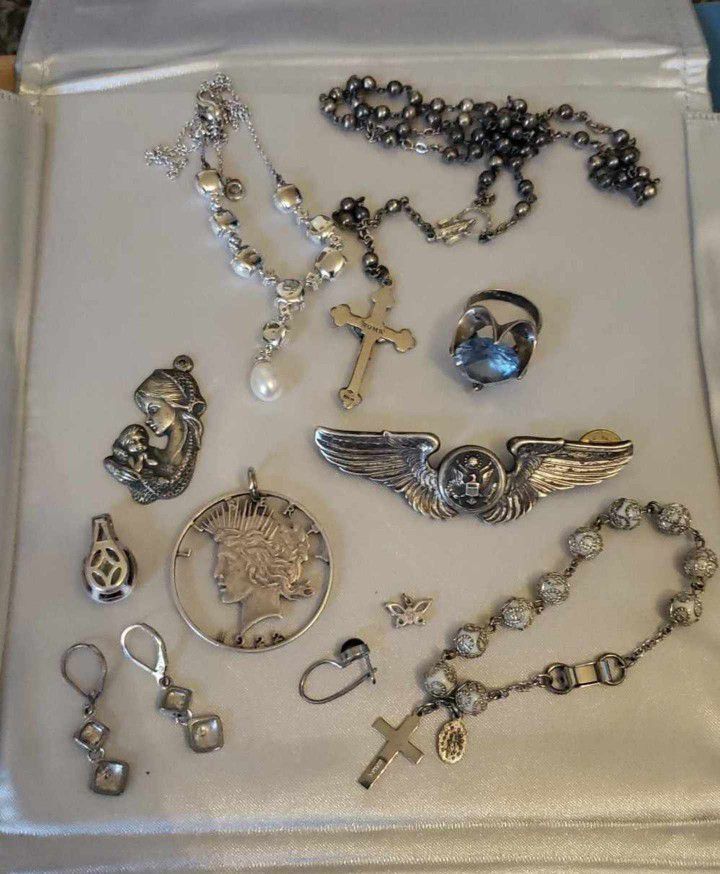VINTAGE STAMPED STERLING SILVER 925 JEWELRY RING EARRING ROSARY NECKLACE BRACELET PENDANT CHARM SET 1922 SILVER DOLLAR WWII PIN