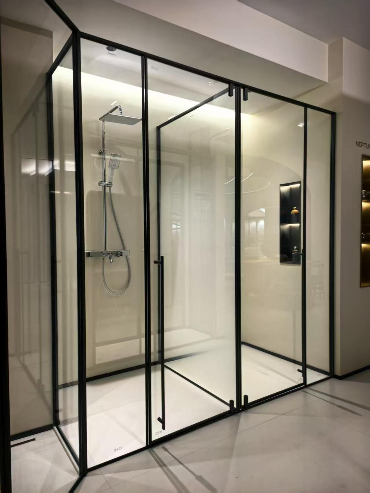 Free delivery ,contact me for more information Premium 304 stainless steel hardware, guide rail, and 2.5mm track. • 3/8" Safety glass with dual-sided coating. • Two 2.17" diameter oversized rollers with two auxiliary rollers. • Includes wall stopper for controlled, anti-rollback function. Easy-Clean Coating With Easy-Clean Coating