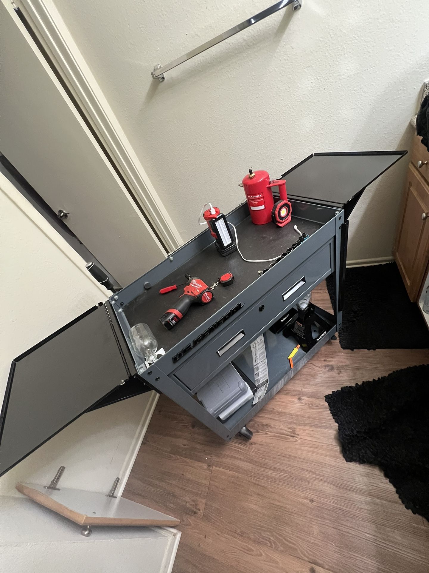 Slate grey 1 drawer tool cart with keys I have customized it with 2 side table to expand work space and tool setting room also added some magnets for exterior storage comes with towel holders aswell.. tools are not included just for examples upgraded to a bigger one fairly new