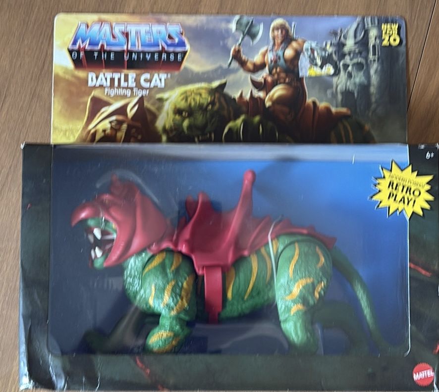 Brand-new, unopened Mattel Masters of the Universe Origins Battle Cat (Fighting Tiger). Measures 6.75 inches tall with 12 articulation points (including jaw, head, shoulders), featuring retro style, modern posing, and removable armor.
