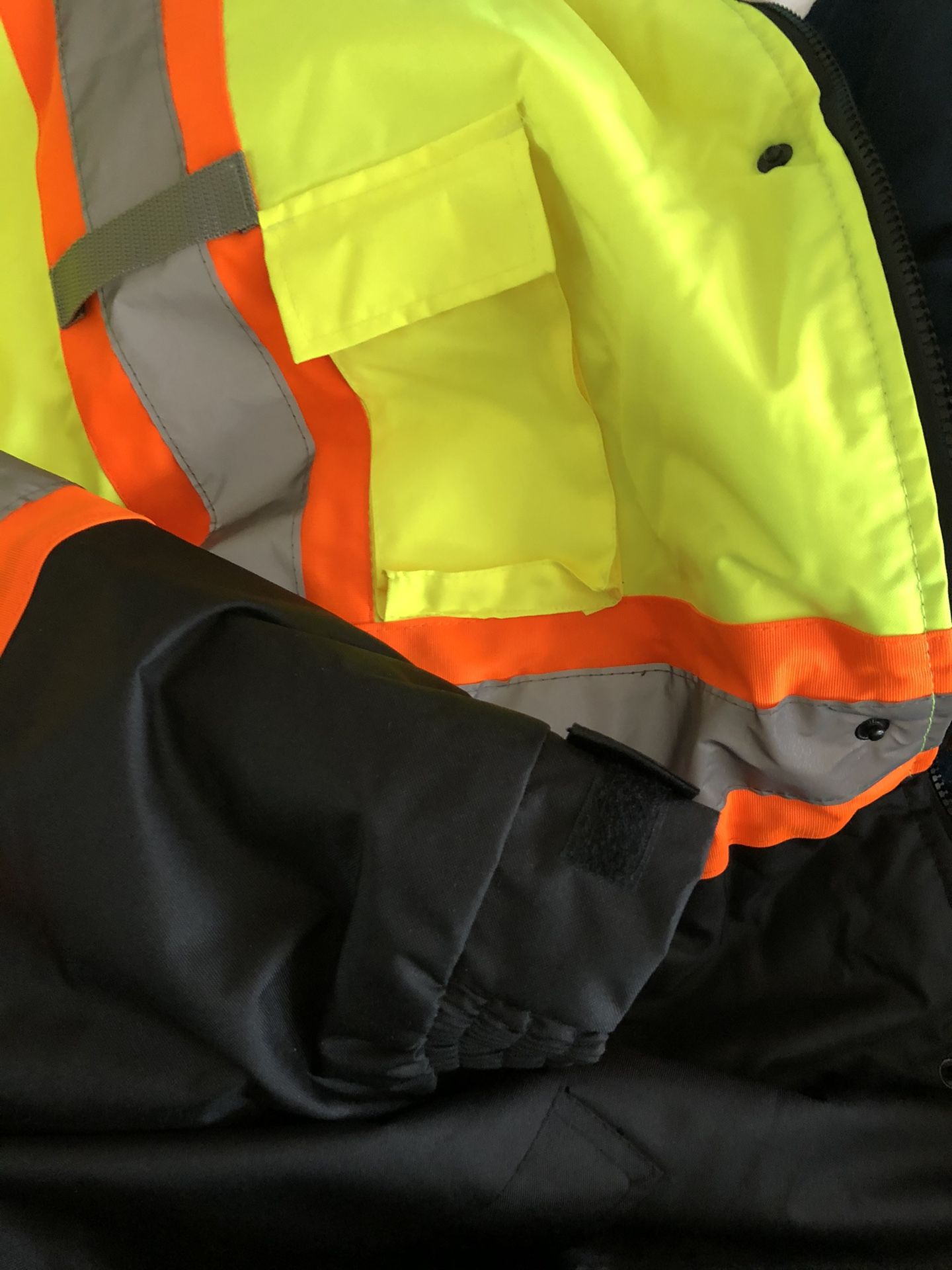 Size 5X man’s work jacket never used brand new wind fleece lined. Zipper and snap buttons, Lots of pockets with a hood that is detachable