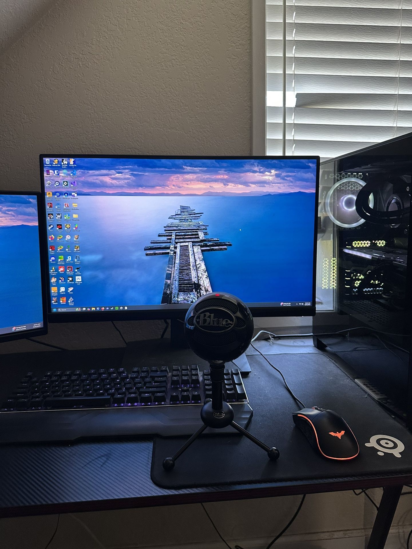 Full gaming PC set up with PC, Monitor, microphone, headset, keyboard and mouse. PC Specs: AMD Ryzen 5 3600 Overclocked AMD RX 6700XT GPU (equiv to RTX 3070) DDR4 3600mhz 16GB RAM MPG X570 Gaming Edge Wifi 1 TB M.2 NVME SSD, 1TB SATA SSD, 2TB total 650 Watt Gold rated power supply 4000D Airflow Case Monitor that comes with it: 1080p 75hz Blue Snowball microphone Gaming Keyboard and Mouse Mousepad