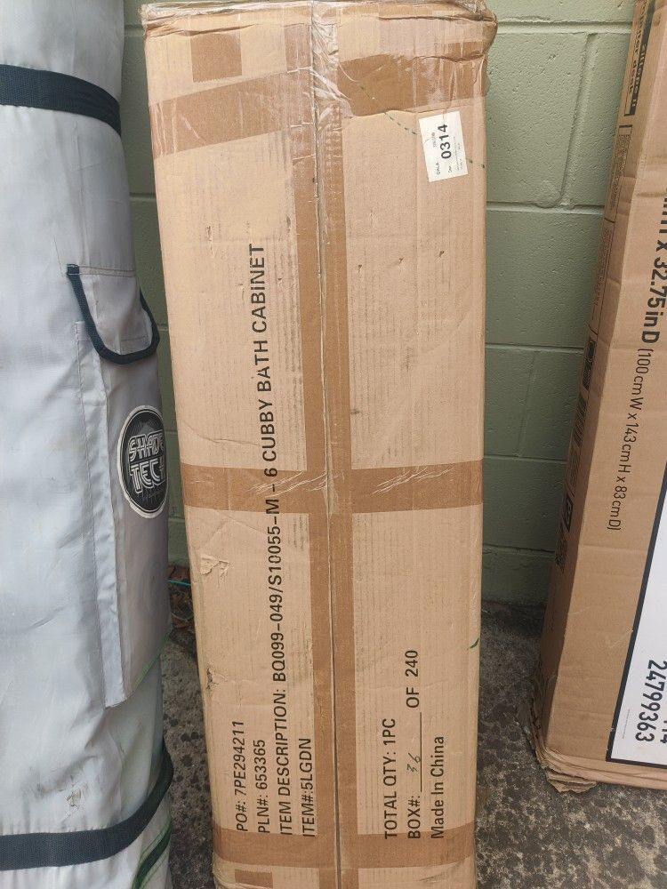 NEW BOX NEVER OPENED 39.76x12.8x8.27in ITEM #5LGDN PO#7PE29411 PLN#653365 DESCRIPTION:BQ099-049/S10055-M-6CUBBY BATH CABINET can be viewed on the web or Amazon
