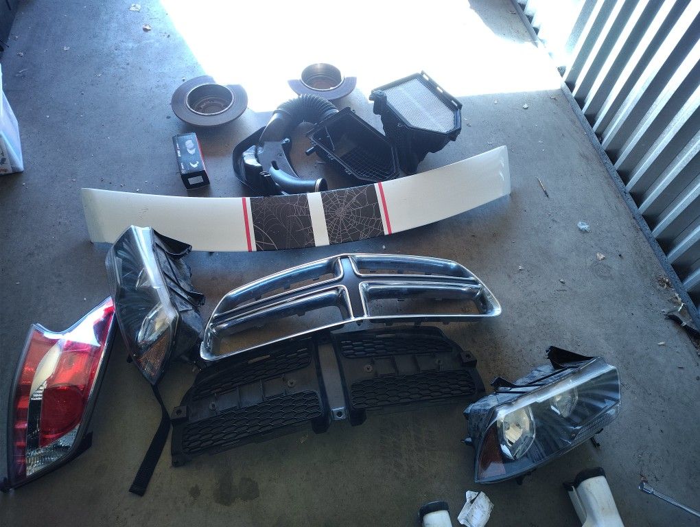 Parts, headlights both lights work, brakes pads , air filter and harness that holds filter, rear rotors rear brake light only one still looking for other grills ext!