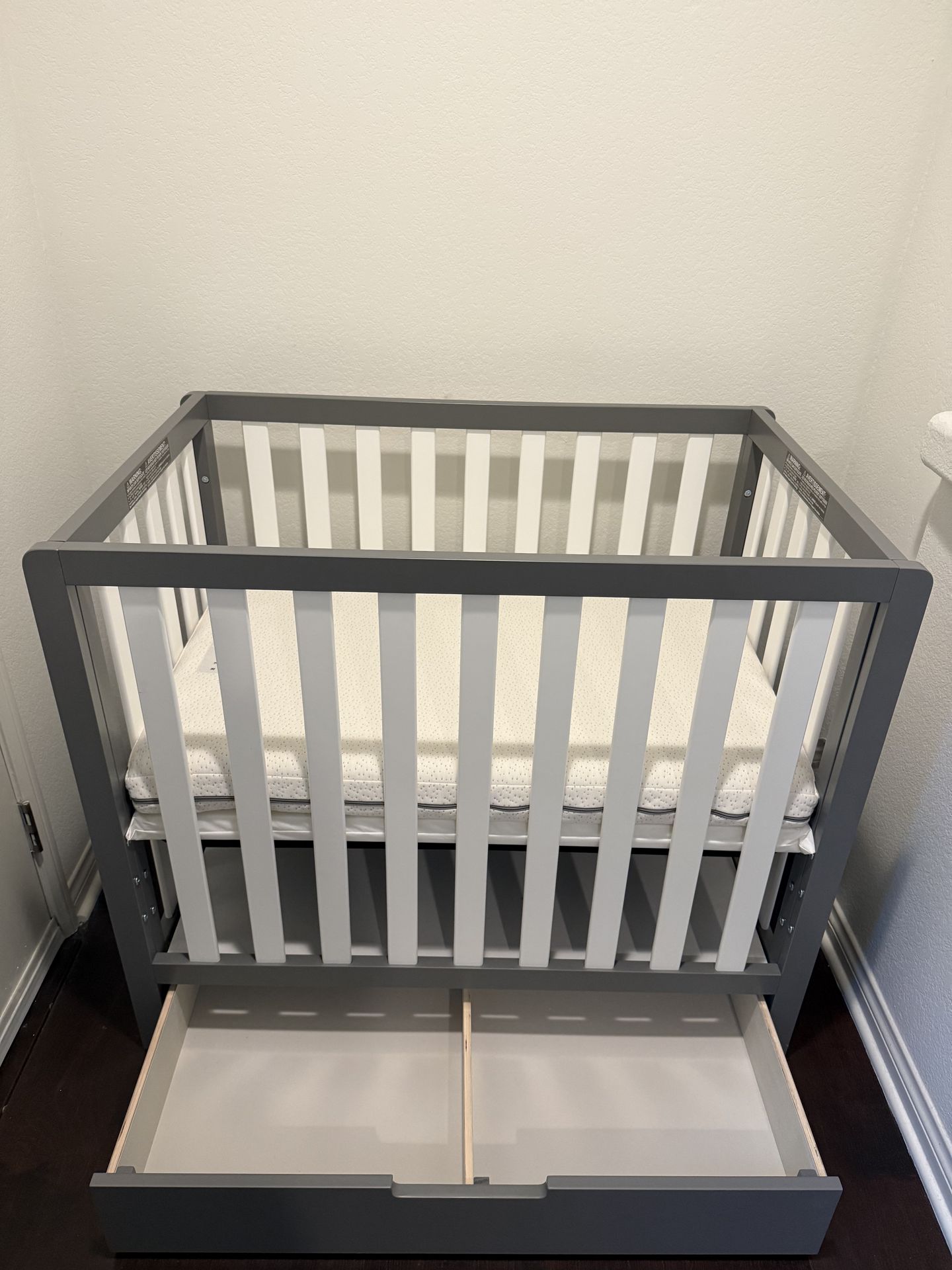 Assembled but never used. The mini crib was fully assembled straight out of the box for convenience and has been sitting untouched since. Perfect for small spaces, plus a built-in storage drawer underneath. Consistently one of the best selling cribs on amazon around $250.
