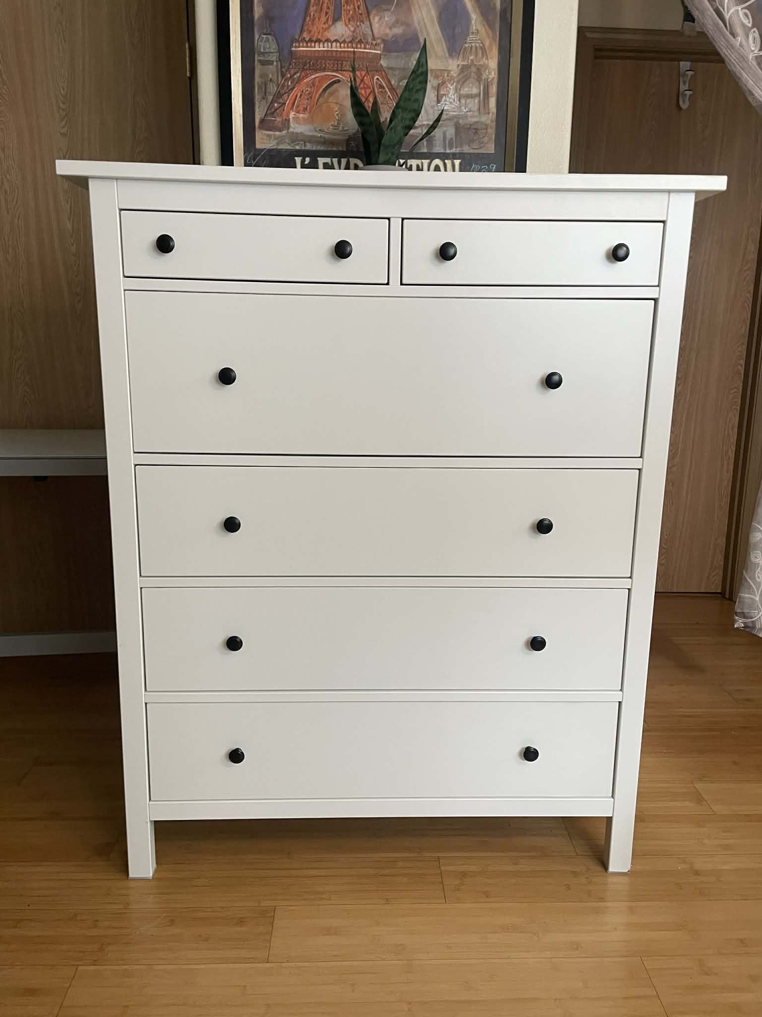 I have for sale, Ikea Hemnes 6- drawer white semi-gloss in excellent pre-owned condition. It has small signs of use here and there but nothing major, drawers open and close smooth. Pet/smoke free home. Please see all pictures for best description. Asking $300 cash only ask for delivery Thank you.