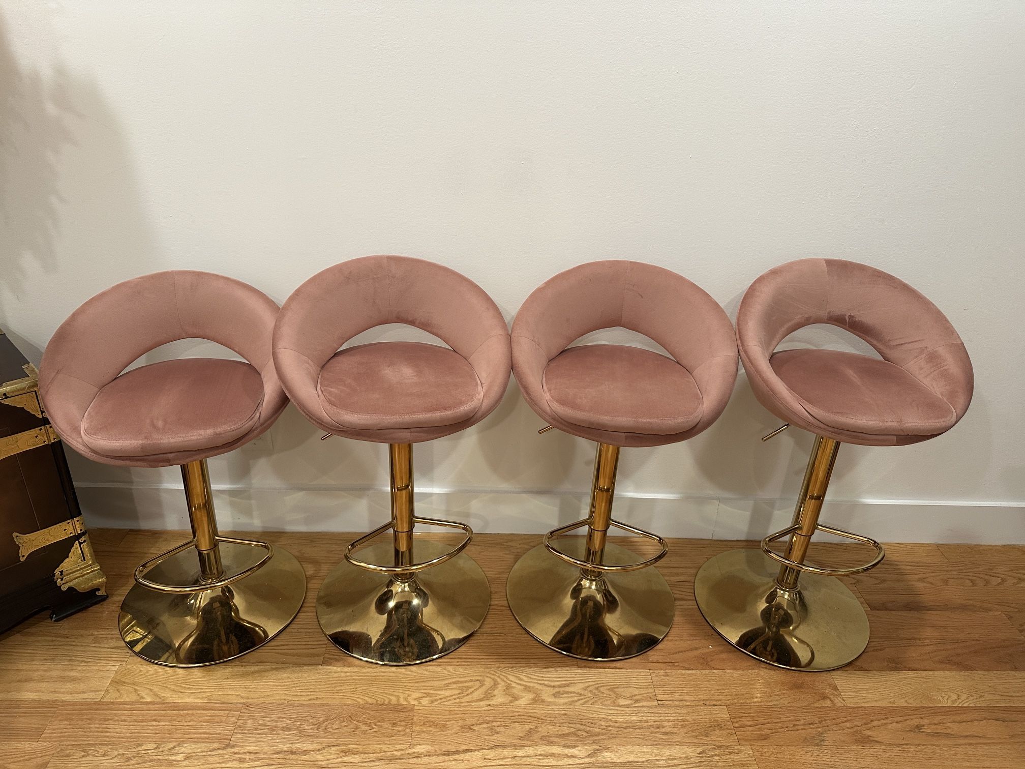 Chic counter-height bar stools. Velvet with gold metal base. 360° swivel seat and adjustable height. Cushioned with high-density foam for comfort. Sturdy chrome base with a non-slip rubber ring for floor protection. Purchased last year for $300.