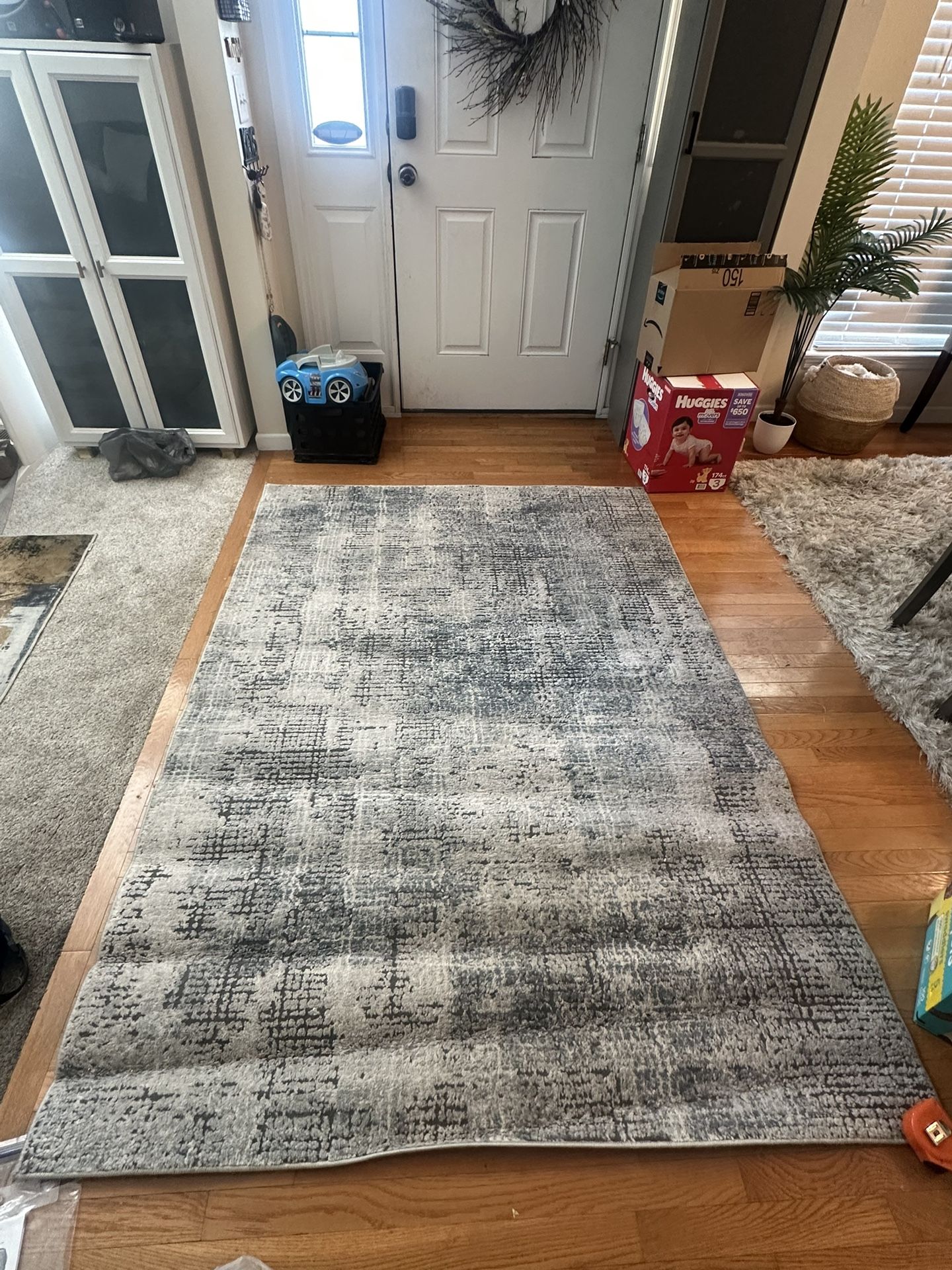 Selling area rug. Has hints of blue, tan, and brown. 7 x 5 dimensions.