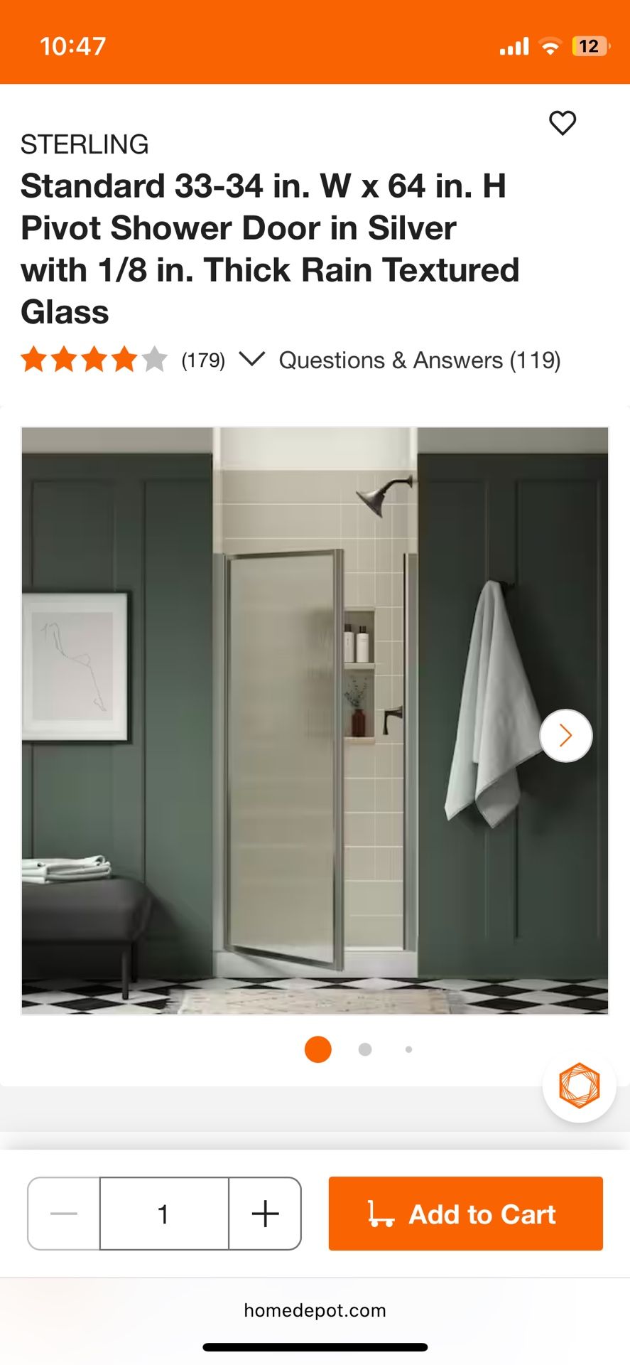 Like new. Standard 33-34 in. W x 64 in. H Pivot Shower Door in Silver with 1/8 in. Thick Rain Textured Glass.