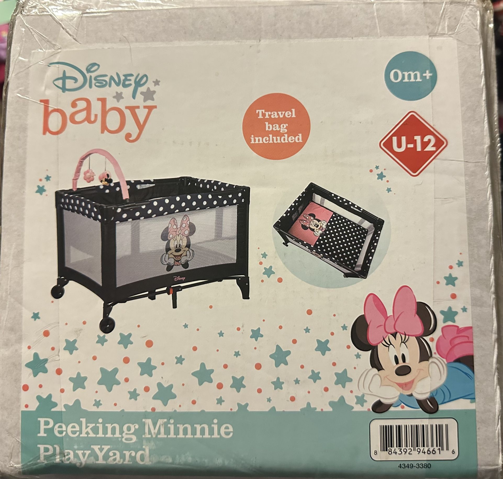 Disney Baby 3D Ultra Baby Play Yard with Bassinet and Toy Bar, Peeking Minnie • Full size play yard • Full size bassinet • Entertaining toy bar with two toys • Minnie graphic mesh side • Quick and compact fold for easy travel • Spacious area for naps and play • Easy to store and transport with carry bag • Assembled Weight: 19.4 lb • Color Category: Black $55 (firm) Smoke/Pet free home Local pick up only Serious buyers only