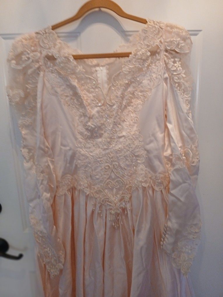 Absolutely gorgeous Vintage Champagne Pink Wedding Dress for Sale. (1989) Size: 10-12 Details: A beautiful combination of light pink satin, lace with tiny pearls and embroidered lace scalloping on the bottom edges. The long rounded train has layered sheer and wavy organza detail, very flowing and princess-like. The front and back are V-line and stunningly feminine with its intricate design. The pictures do not do this dress justice. The upper sleeves are ample with a lacy transition of embroidery and tiny pearls with laced edges laying a soft point over each hand. If you're looking for the ultimate feminine looking dress, this it it. The dress is in great condition, with minor discoloring on a few of the edges and one spot on the innerside of the train. Please see the pictures. None are greatly noticeable, but I would recommend cleaning. There are no filters on the photos. This includes two headresses. One matches the dress and the other was more of a back-up. Please ask if you have any questions. Selling as is. I'm asking $600. I will consider a Trade for like value item(s). Thank you for looking! Key words: wedding, dress, nuptials, occasion, ceremony, satin, lace, beads, girl, princess, pink, vintage, women's, clothing, celebrate, anniversary, bride, bridesmaids, flower girl, barbie, marriage, thread up, recycle, whimsical, Cinderella, beauty, intricate, memorable, stunning