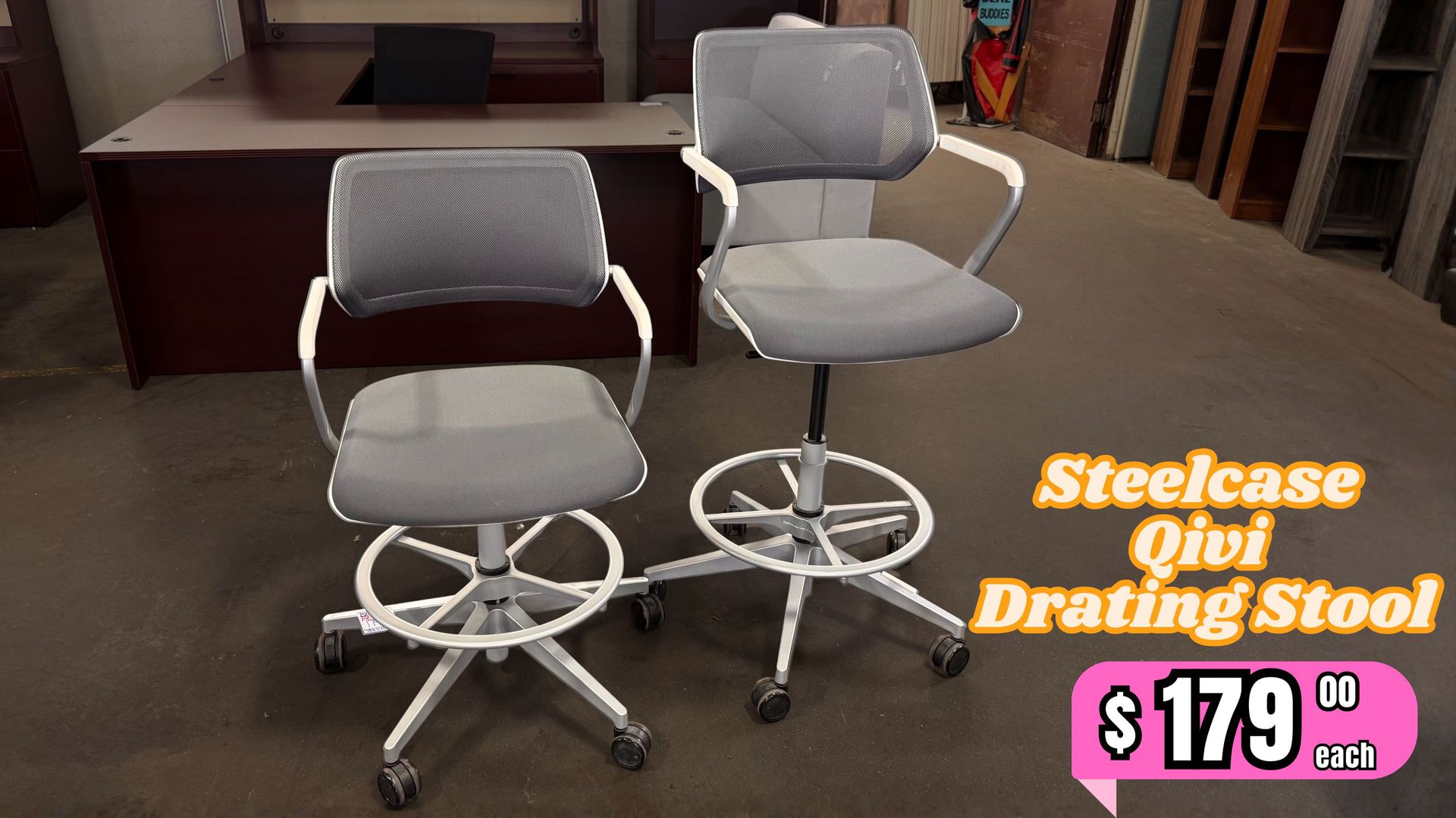 Steelcase Qivi Drafting Stool Grey Mesh Back Grey Fabric Seat White Base and Frame Seat Adjust from 23″H – 31″H Seat Measurements: 19 1/2″W Come Check Us Out! Business Hours: Monday - Friday 8:30am - 5:00pm CLOSED Weekends TR Trading Company