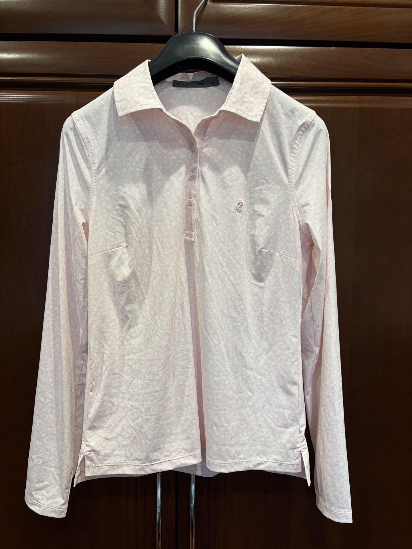 New- G/FORE Women’s Soft Pink Floral Long Sleeve Golf Shirt - Size XS Brand new, never worn. It does not have the tag. Size XS, too small on me. I removed tag but never wore. Light pink floral long sleeve. UV protection. Pink floral pattern and golf club emblem on left shoulder (as photographed). Perfect condition. Retails $120.