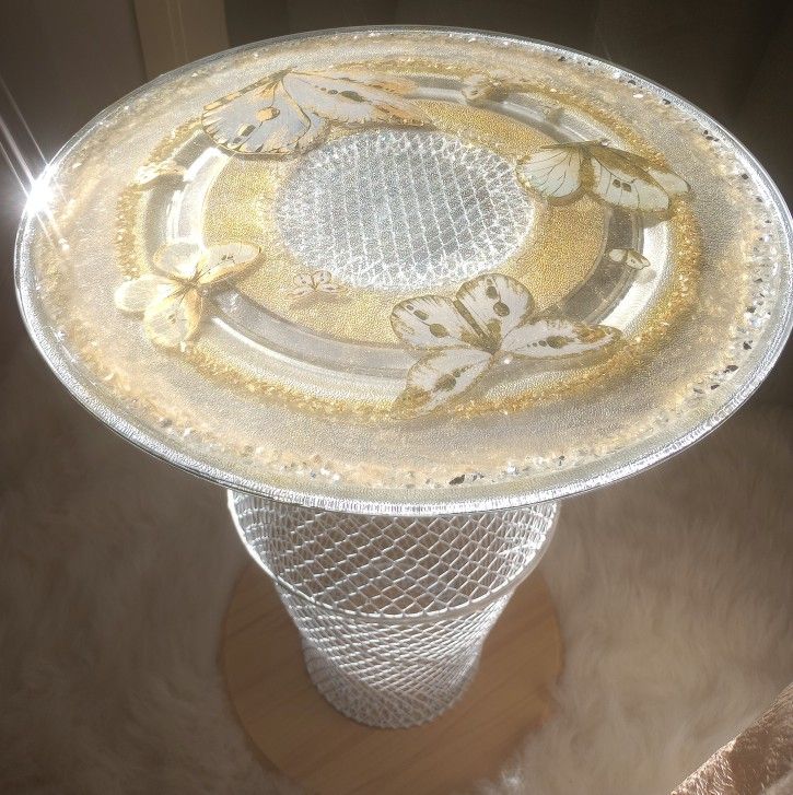 Add a touch of elegance with this unique butterfly table. This one of a kind artwork features a beautiful homemade design made with high quality resin and glass materials. Different table bases are available. 15" diameter