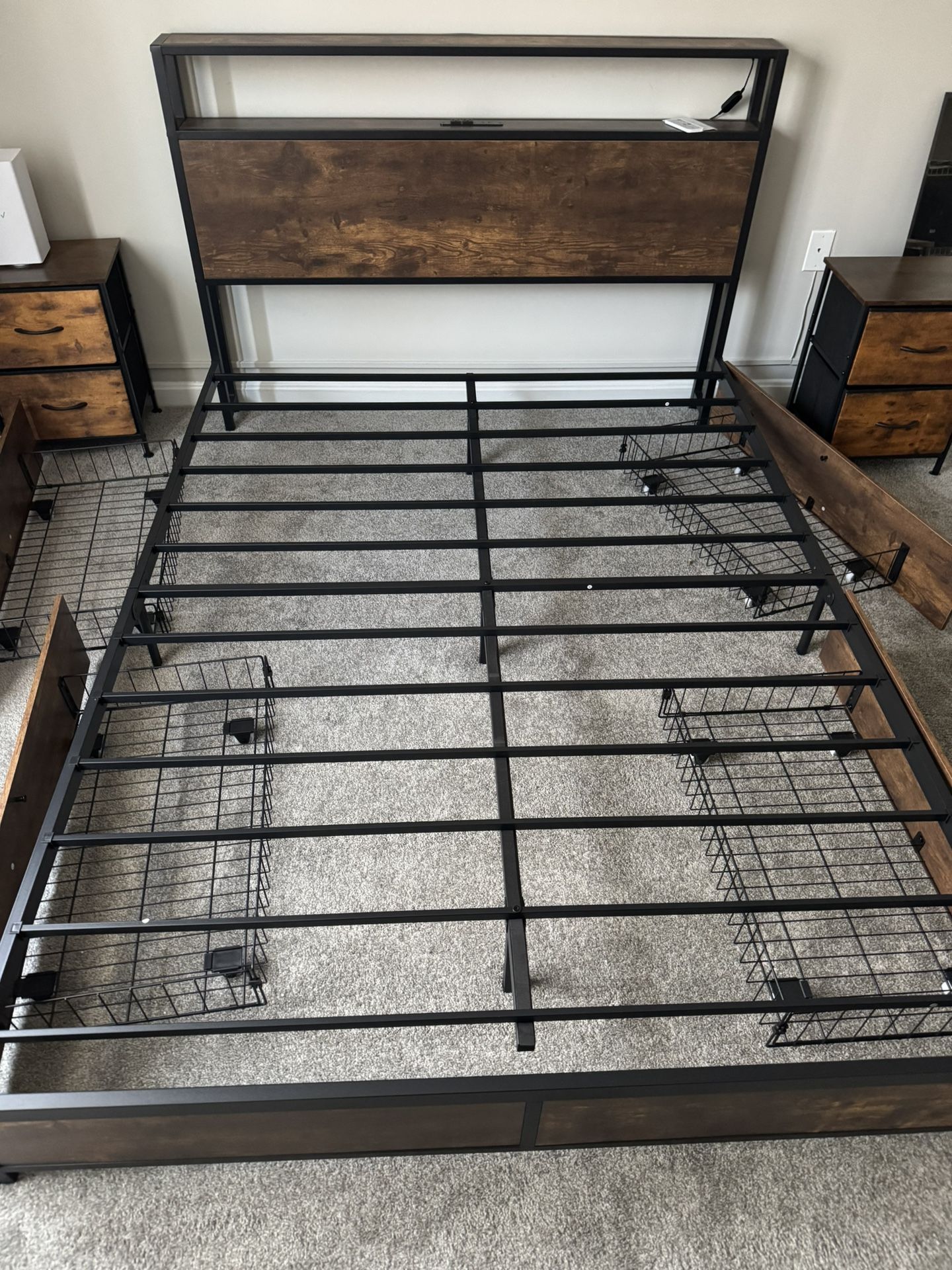 Brand New Queen Bed Frame and 2 End Tables Bed has 4 drawers for storage and lights up with remote.