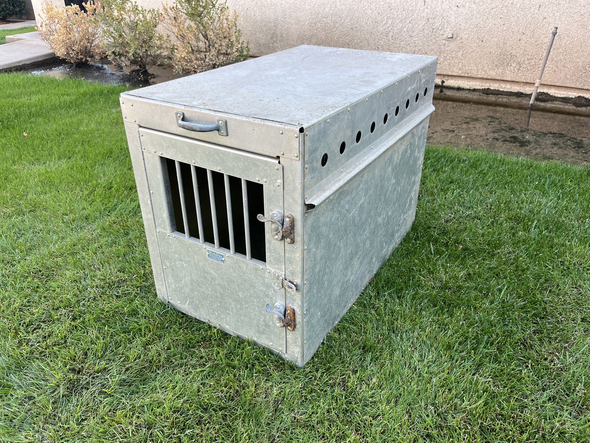 Large Vintage Airborne Heavy Duty Dog Pet Wildlife Airline Cargo Crate Carrier. Great for breeders and animal dealers to transport animals by air, or transporting trapped wildlife off the ranch, or kenneling animals at home. Measures about 30" long, 18" wide, and 22" tall. The swinging gate measures about 14" wide and 18" tall. Pick up in Fresno Ca. No deliveries, No trades. Cash, Venmo, Apple Pay accepted. Se habla espanol.