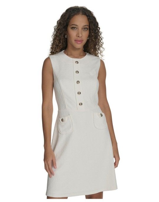 Tommy Hilfiger petite dress. White/off-white basket-weave texture. Sleeveless with button-front and 2 front pockets. Back zipper closure. Size 14. Original price $119. Sale price $79.99