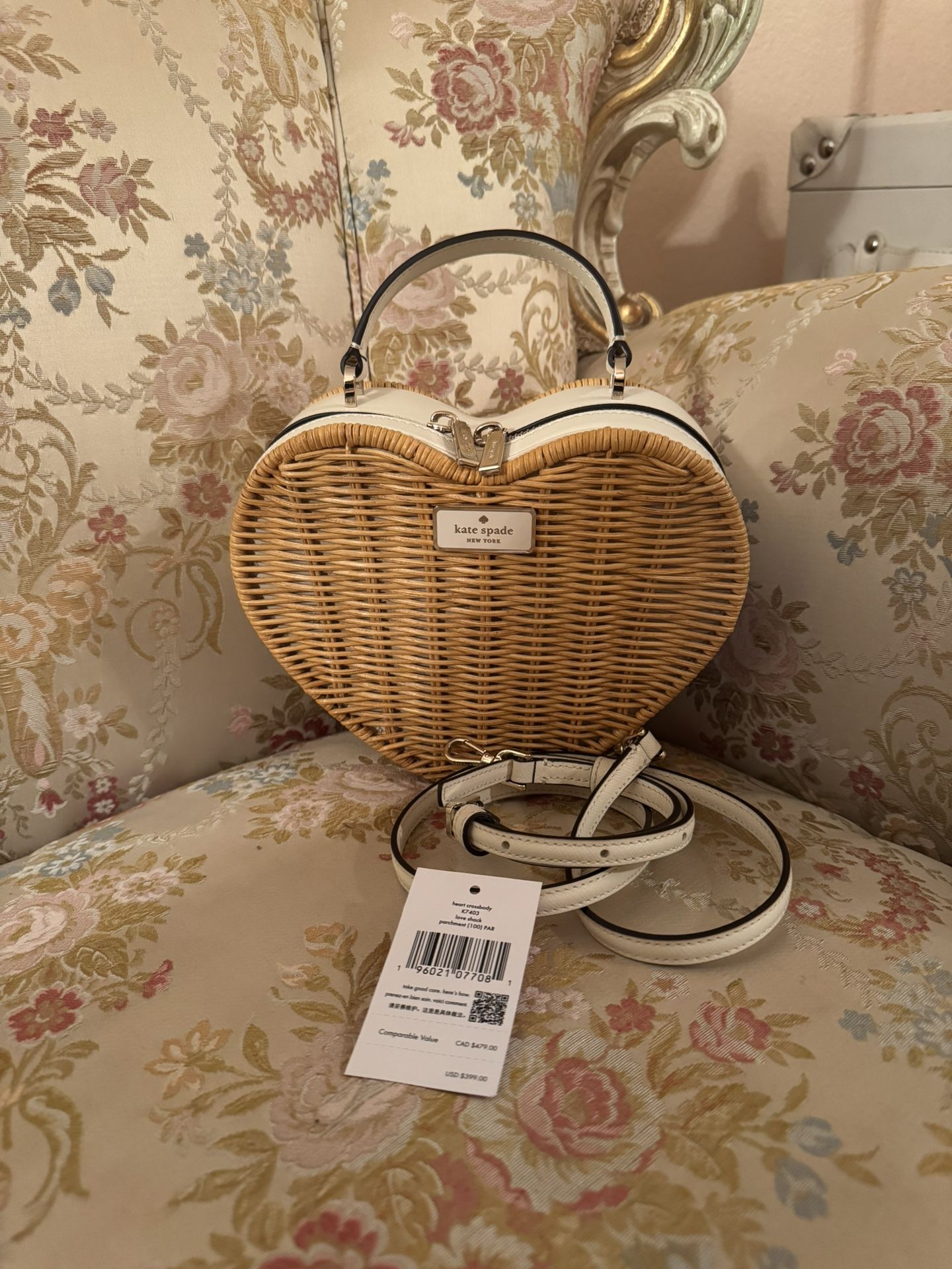 New With Tags , retail $399 Kate Spade New York love shack heart wicker crossbody, removable strap