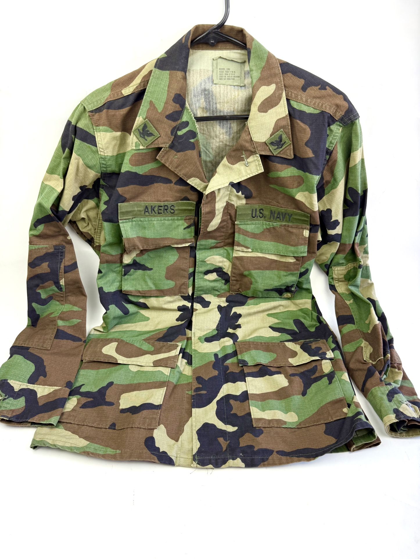 Vintage U.S. Navy Green Woodland Camo Camouflage Combat Coat Uniform Shirt Med Has U.S. Navy patch & Akers patch on chest. Has what appears to be 2 CPO Chief Petty Officer patches in collar. Button-up, 4 pockets, button sleeves. Size is Medium-Long. Height: from 71 to 75. Chest: from 37 to 41. Stock no. 8115-01-(contact info removed). NATO size: 8090/9404. Very good used condition. 1554