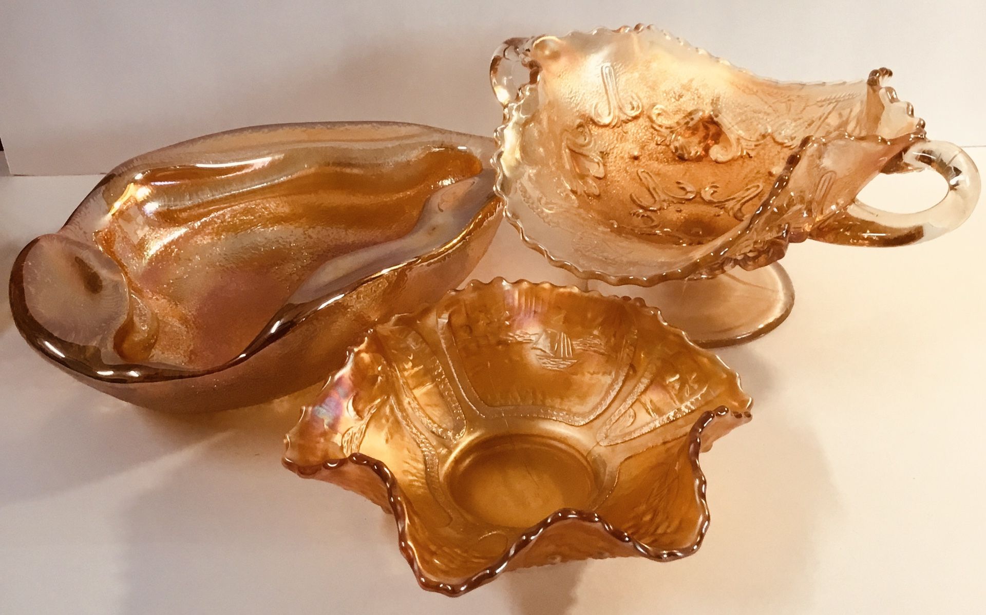 Vintage Collectible Marigold Carnival Glass. (1) Marigold Detailed Footed Nappy Puzzle Pattern By Dugan Raised Roses. (1) Large Marigold Iridescent Fashion Bowl, (1) Marigold Bowl Small Ruffles Edges With Sail Boat Design Inside. All In Excellent Condition.