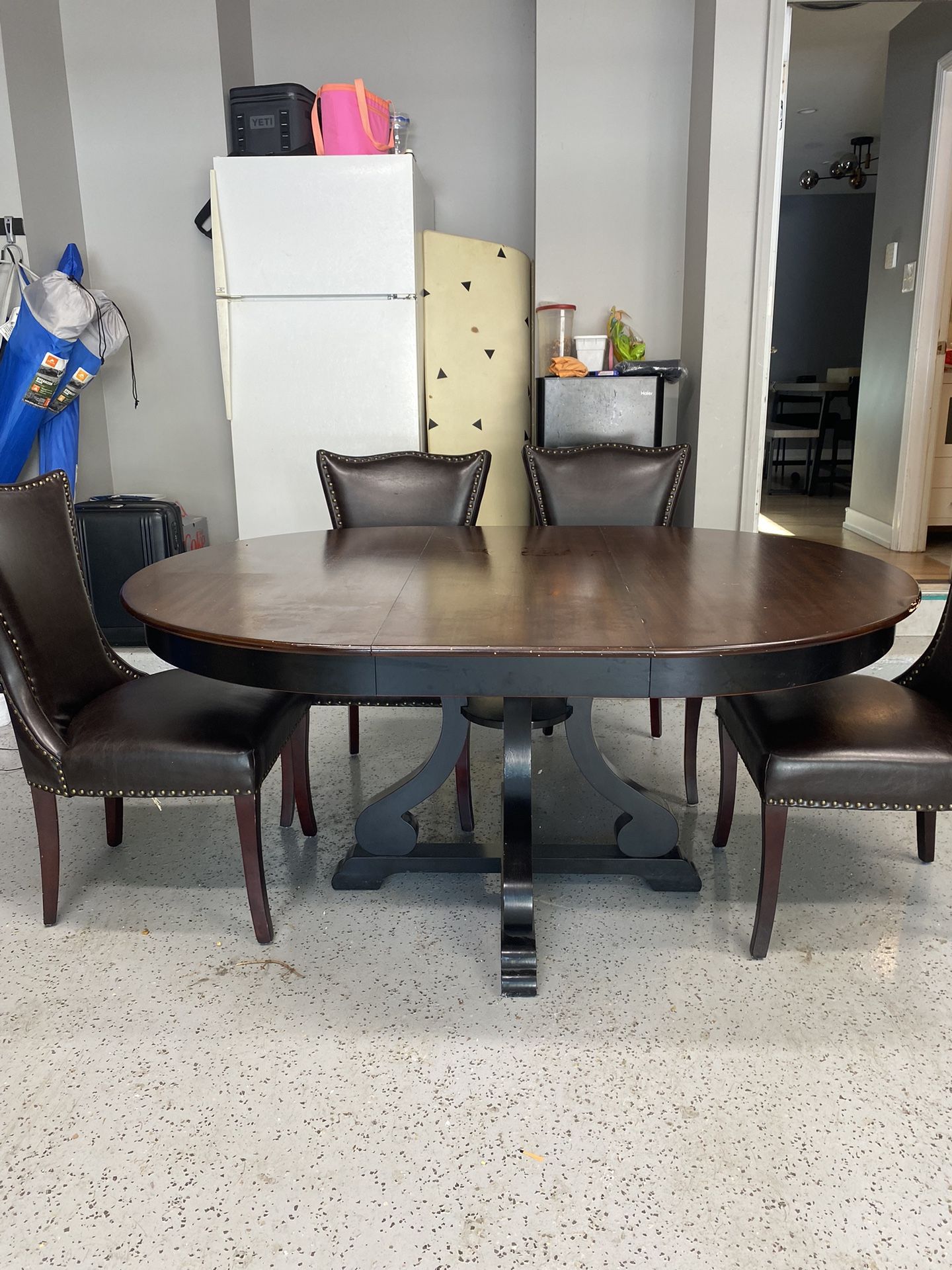 Pier one dining room table with alittle but if wear with 5 leather chairs in great condition. I can send more pictures upon request. We bought a new one so want to get rid of this one