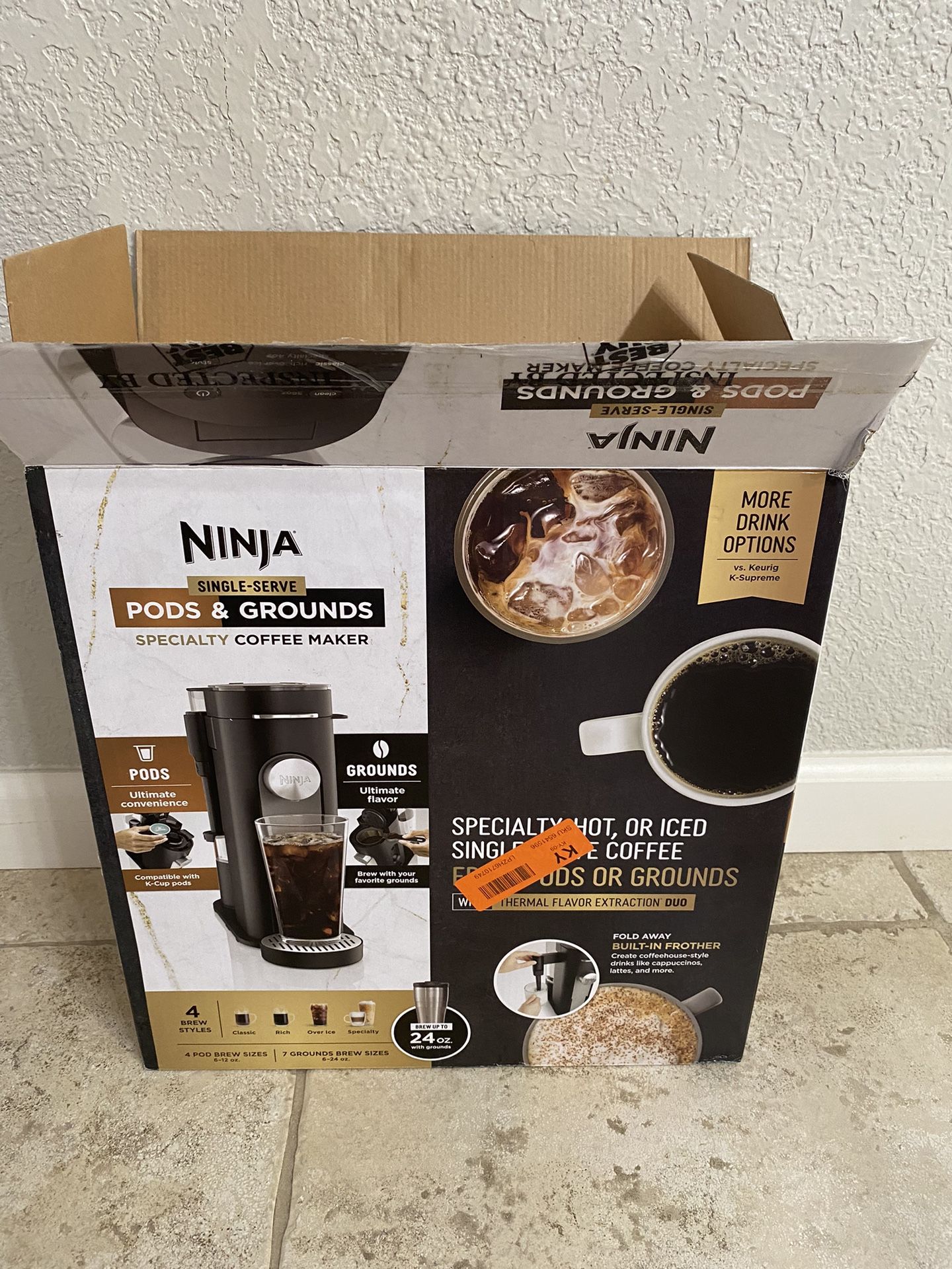 Ninja PB051 Pod & Grounds Specialty Single-Serve Coffee Maker, K-Cup Pod Compatible, Brews Grounds, Compact Design, Built-In Milk Frother, 56-oz. Reservoir, 6-oz. Cup to 24-oz. Mug Sizes, Black Open Box New with complete accessories in original box packaging
