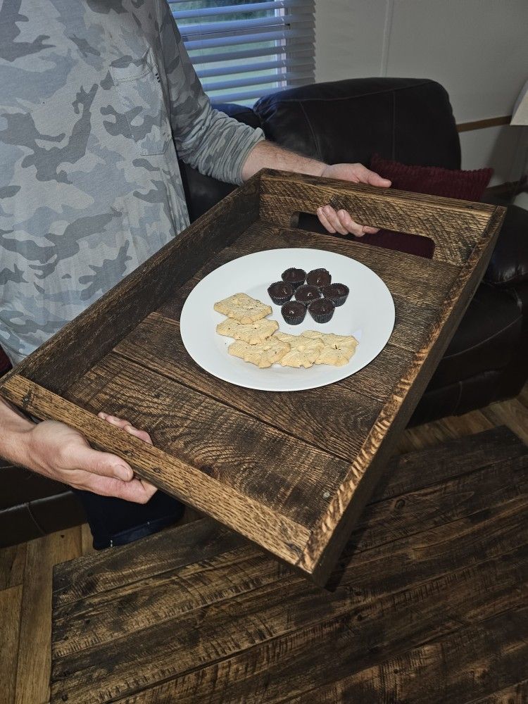 Handmade and customized serving tray/magazine tray made out of reclaimed pallet wood. Serving tray only. Serving tray shown in picture is: 21” long 15” wide Serving tray shown in pictures unstained $25 Serving tray shown in pictures with stain and danish oil $25 Finished with the walnut stain and danish oil, the danish oil repels stains and water/spills etc. protects the wood and material. Price can be given for customized orders placed to fit your need for dimensions. Other furniture can be built as well just let us know what you're looking for and we will get you a quote if we are able to make it. Additional furniture will be posted as it's made. Delivery options available with a fee. Pickup in Greenville