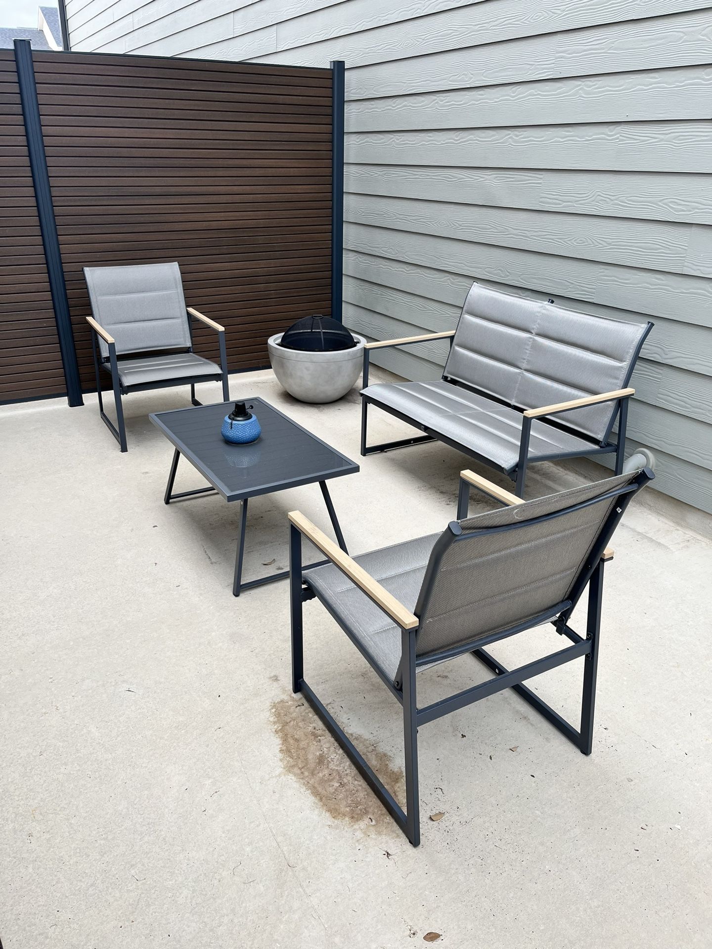 Modern patio set includes a comfortable two-seat loveseat, two matching armchairs, and a sturdy coffee table, all featuring durable metal frames with gray weather resistant cushions and natural wood-tone armrests. This set is in excellent condition and ready to elevate your patio or balcony. **fire pit NOT included** $250 OBO - Must pick up