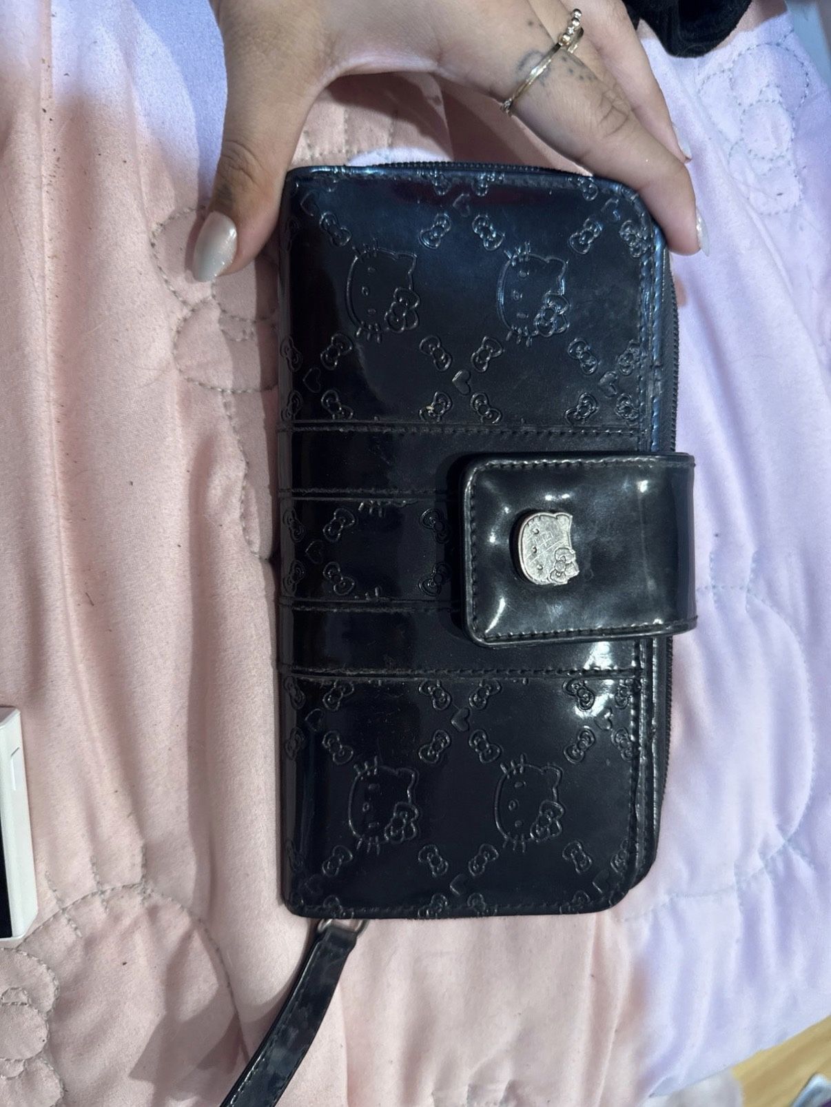 Hello Kitty Loungefly Folding black Patent Leather Wallet from 2009 in fair to good preowned condition as it has multiple stains on the inside leather there’s pictures showing on the coin pouch and ither i side fabric SEE PHOTOS ABOVE. I do not know how to remove. The wallet is otherwise in great physical condition. PLEASE SEE ALL PHOTOS FOR FLAWS & more details as the photos serve as part of the description as well... Item shown in photos is the exact item you will receive. Please view all photos for more detailed description. ****NO RETURNS****