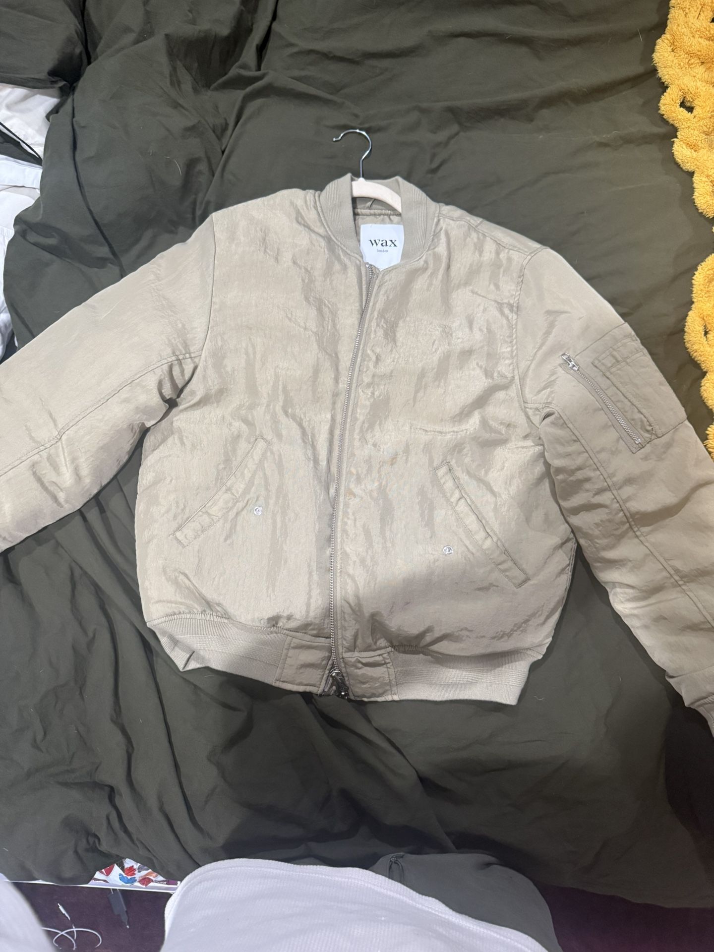 Never worn WAX LONDON tan Bomber jacket for sale (tag still on) Size: Small It was a Xmas gift and it just wasn’t my style. Retail Price: 375$ Shell fabric: 100% Nylon Inside Lining : 100% Cotton Inside Sleeve Lining: 100% Polyester