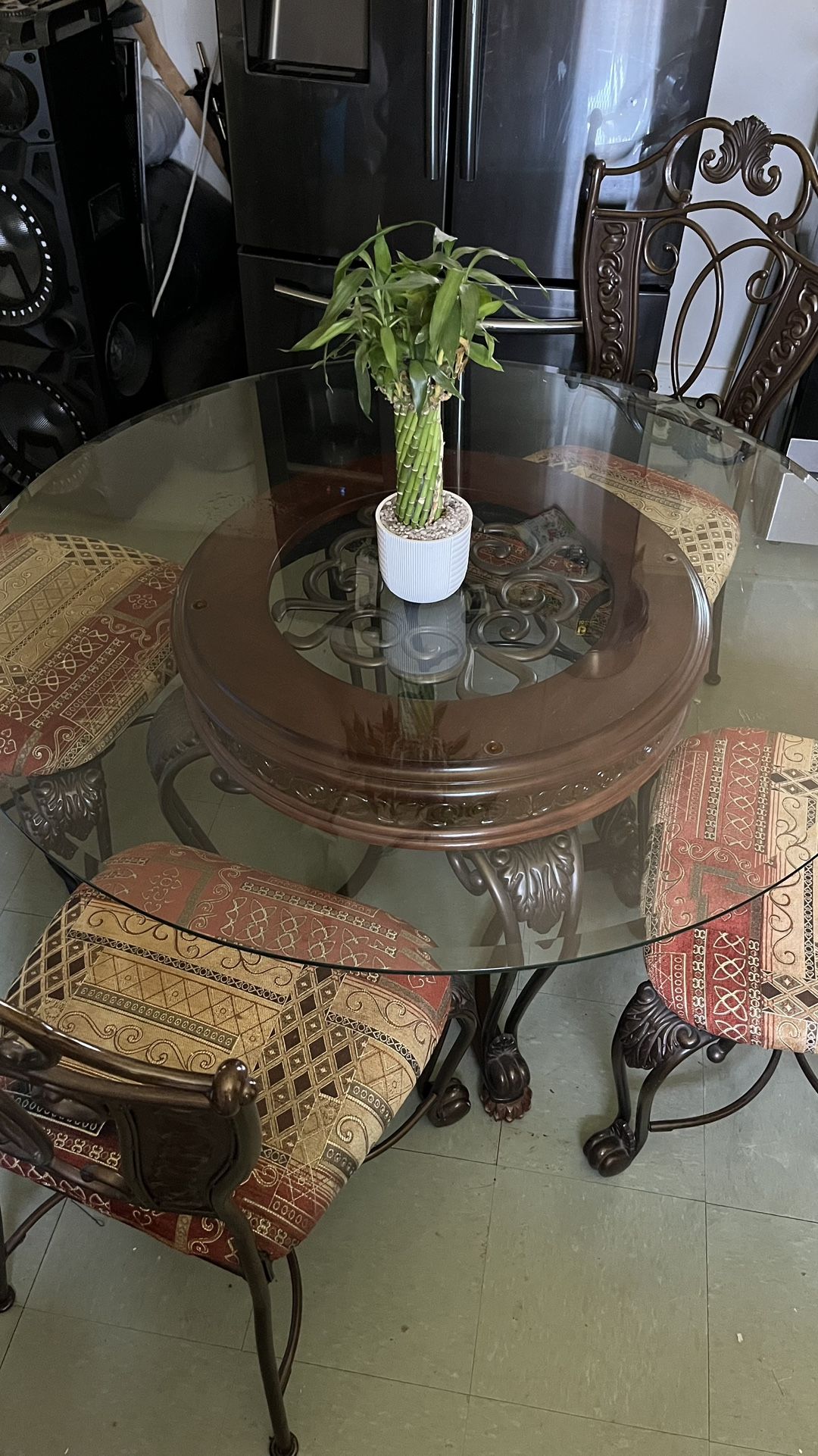 Ashley furniture 5 piece dining table, thick glass top with metal legs and 4 matching wrought iron chairs. Heavy metal.