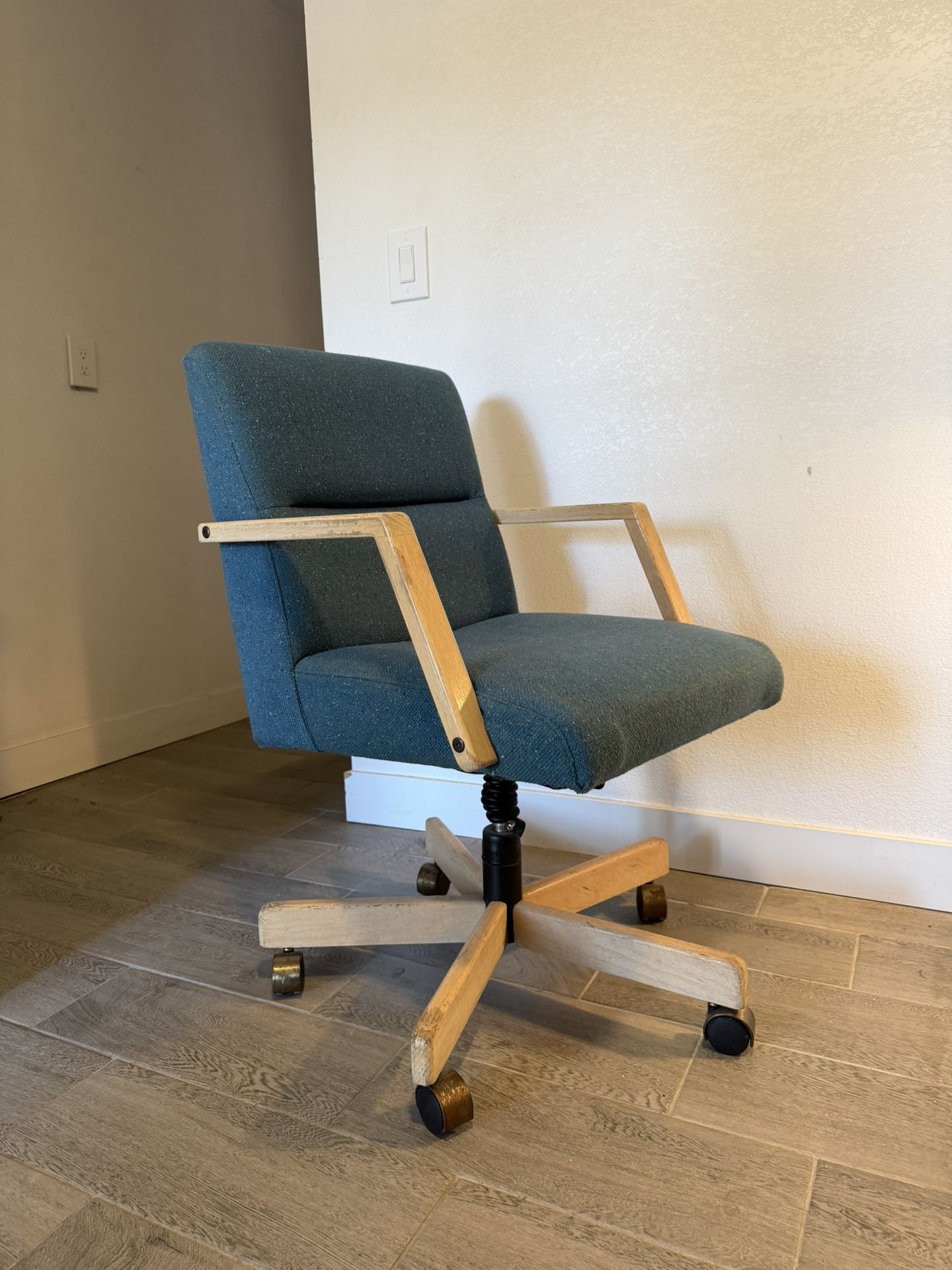 Not firm on price! Cook vintage chair Blue char with wood frame Vintage Chair Not too sure of dimensions but it’s a perfect size!
