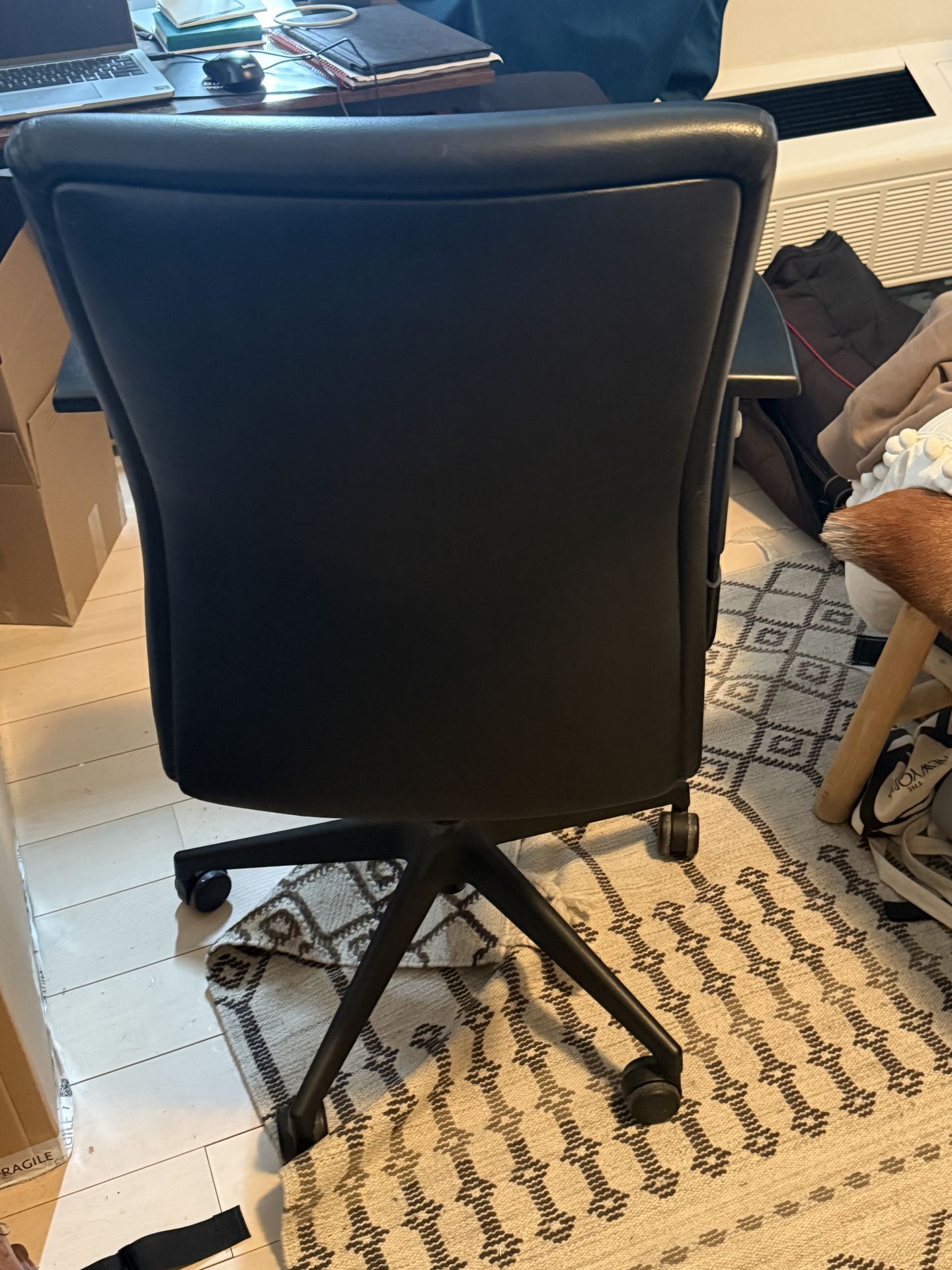 Comfy black office chair. Has armrests and wheels for easy moving. Adjustable height and comes with a mesh lumbar support cushion. Small dent in one of the arms