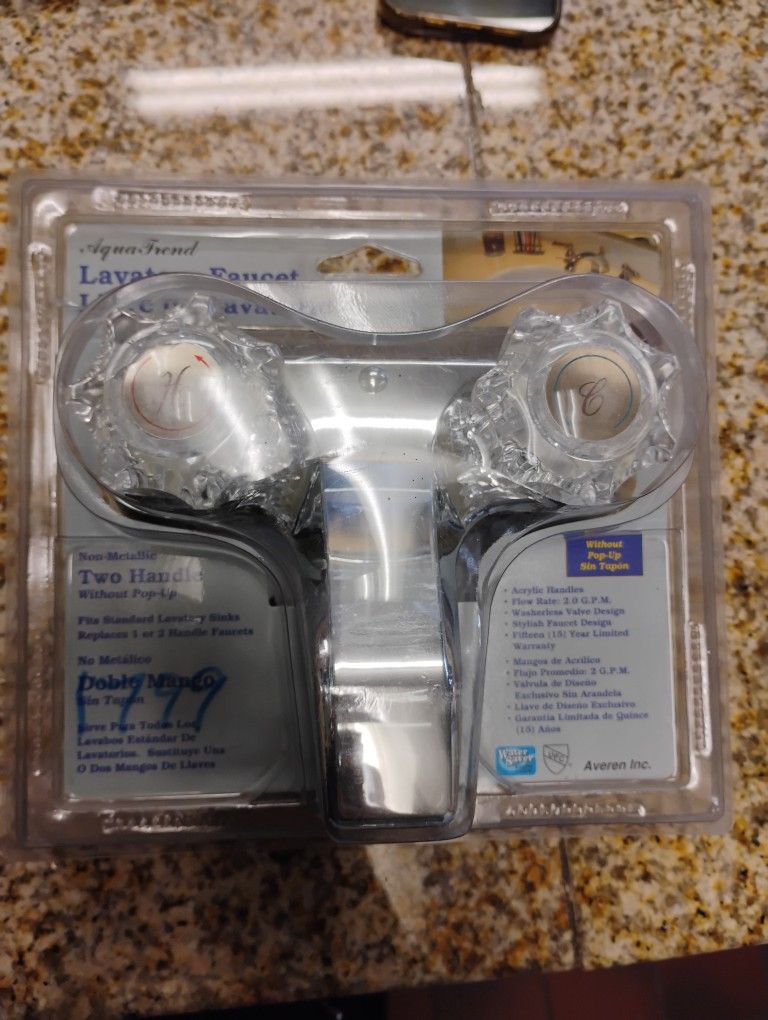 Non metallic two handle without pop up Fits standard lavatory sinks Acrylic handles Flow rate 2.0 gpm Washer less valve design Stylish faucet design No metálico Doble mango Sin tapón Sirve para los lavabos estándar de lavatorios. Mangos de acrílico Flujo promedio de 2 gpm