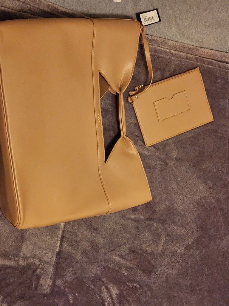 Tan Bebe faux leather handbag with pouch. Perfect date night handbag.